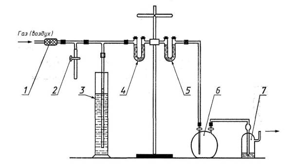 1 - трубка с гигроскопической ватой: 2 - винтовой зажим; 3 - маностат; 4,5 - U-образные трубки; 6 - пикнометр; 7 - склянка (счетчик пузырьков) Рисунок 1. Перед отбором пробы пробоотборную линию продувают испытуемым газом через тройник, соединяющий ее с установкой для заполнения пикнометра с помощью резиновых или полиэтиленовых трубок. Давление в пробоотборной линии должно превышать атмосферное примерно на 10 кПа. 3.3. Пробы в контейнеры отбирают способом сухой продувки под давлением, соответствующим давлению газа в месте отбора. Контейнеры должны быть испытаны на давление, превышающее рабочее в 1,25 раза. Перед отбором пробы газа в контейнер пробоотборную линию продувают газом в течение 1-2мин для удаления остаточного газа (воздуха). Пробоотборную линию присоединяют к входному вентилю контейнера, установленного вертикально или горизонтально. При закрытых вентилях контейнера открывают вентиль пробоотборной линии и плавно открывают входной вентиль контейнера, чтобы контейнер заполнялся газом постепенно. Когда давление газа в контейнере и точке отбора пробы выравняется, плавно открывают выходной вентиль контейнера и продувают его газом так, чтобы давление в нем поддерживалось на уровне полного давления газа в газопроводе. В процессе отбора пробы через контейнер необходимо пропустить газ в объеме, в 10-15 раз превышающем вместимость контейнера. После окончания продувки контейнера газом закрывают его выходной вентиль, затем - входной и вентиль на пробоотборной линии. Контейнер отсоединяют от пробоотборной линии и проверяют на герметичность погружением его в воду или обмыливанием. Контейнер транспортируют в лабораторию, соблюдая правила безопасности. Пробы хранят в отапливаемом помещении. Перед отбором пробы газа в пикнометр контейнер выдерживают в помещении лаборатории не менее 2ч. Не допускается применять вытесняющие жидкости для перевода газа из пробоотборника в пикнометр. 4. Средства измерений, материалы и реактивыПикнометры стеклянные газовые типа ПГ по ГОСТ 22524, вместимостью 100 и 200 см3. Весы лабораторные общего назначения по ГОСТ 24104: с пределом взвешивания 200г, не ниже высокого класса точности (св. 5000е до 20000е); с пределом взвешивания 500 и 1000г. Предельная допустимая погрешность: - при первичной проверке - ±1.0е; - в эксплуатации - ±2,0е. Меры массы по ГОСТ 7328. Микрокомпрессор типов ВК-1, МК-Л2 или другой источник, обеспечивающий подачу воздуха, не загрязненного посторонними примесями масла, газов, пыли. Средства измерения расхода газа: счетчик газовый барабанный (с жидкостным затвором) РГ-7000, вместимостью 2-5дм3, номинальным расходом не более 750дм3/ч, не ниже 2-го класса точности или ротаметр по ГОСТ 13045 типа РМ или реометр по ГОСТ 9932 типа РКС-1-0,25 или РКС-1-0,40, или другие средства измерений, обеспечивающие измерение скорости газа 100-200 см3/мин. Барометр-анероид типов БАММ-1, М-67 или другие, обеспечивающие измерение атмосферного давления с погрешностью ±0,1 кПа. Термометр лабораторный стеклянный со шкалой от 0 до 55ºС и ценой деления 0,1°С. Печь муфельная, обеспечивающая нагрев до 600°С. Эксикатор по ГОСТ 25336, исполнения 2. Противень металлический. Чашка фарфоровая термостойкая по ГОСТ 9147, №№ 5 или 6. Зажим винтовой. Пробоотборники (контейнеры) двухвентильные, обеспечивающие отбор проб при давлении в точке отбора. Плитка электрическая. Баня водяная. Трубк