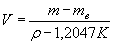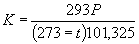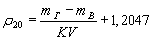 где m - масса пикнометра с дистиллированной водой, г; mв - масса пикнометра с сухим воздухом, г; ρ - плотность дистиллированной воды при температуре опыта, кг/м3 (приложение А); 1,2047 - плотность сухого воздуха при стандартных условиях (t = 20°С, Р = 101, 325 кПа), кг/м3 (приложение Б); К - коэффициент для приведения плотности сухого воздуха при стандартных условиях (T = 293 К, Р = 101,325кПа) к условиям опыта (T, Р); находят по таблице приложения Б или вычисляют по формуле: