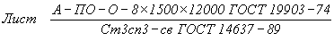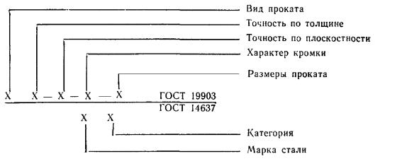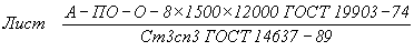 Примечание. Параметры и характеристики проката, приведенные в схеме, если они не указаны в заказе, устанавливаются изготовителем и в обозначении не приводятся. Примеры условных обозначений: Лист повышенной точности (А), особо высокой плоскостности (ПО) с обрезанной кромкой (О), размерами 8´1500´12000 мм по ГОСТ 19903 из стали марки Ст3сп, категории 3 по ГОСТ 14637: