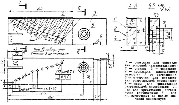 Чувствительность, характеризуемая размерами и глубиной залегания выявляемых искусственных отражателей, выполненных в образце из материала с определенными акустическими свойствами. При ультразвуковом контроле сварных соединений условную чувствительность определяют по стандартному образцу СО-1 или по стандартному образцу СО-2, или по стандартному образцу СО-2Р. Условную чувствительность по стандартному образцу СО-1 выражают наибольшей глубиной (в миллиметрах) расположения цилиндрического отражателя, фиксируемого индикаторами дефектоскопа. Условную чувствительность по стандартному образцу СО-2 (или СО-2Р) выражают разностью в децибелах между показанием аттенюатора при данной настройке дефектоскопа и показанием, соответствующим максимальному ослаблению, при котором цилиндрическое отверстие диаметром 6 мм на глубине 44 мм фиксируется индикаторами дефектоскопа |