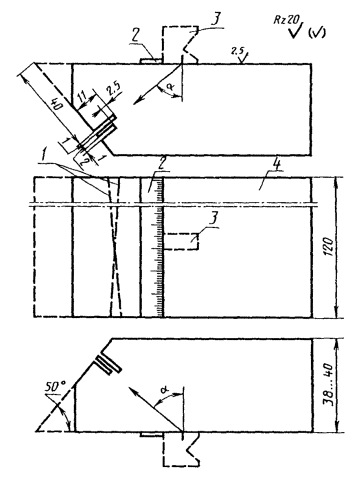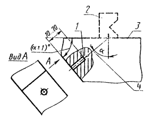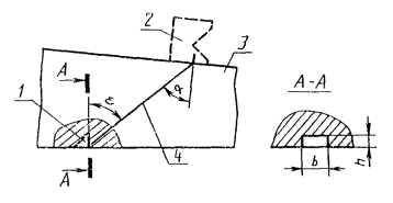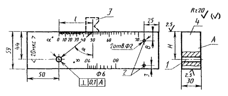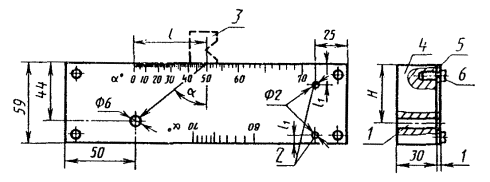1 - пазы; 2 - линейка; 3 - преобразователь; 4 - блок из стали марки 20 по ГОСТ 1050-74 или стали марки 3 по ГОСТ 14637-79; разность глубины пазов на концах образца (h); ширина образца (l).