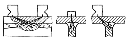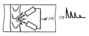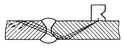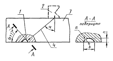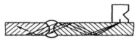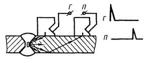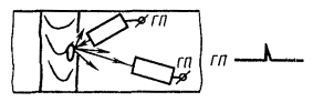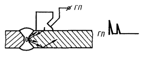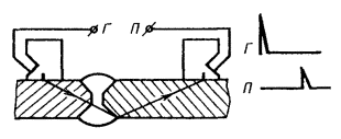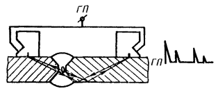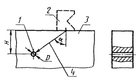 5 должны быть ± Высота h сегментного отражателя должна быть больше длины ультразвуковой волны; отношение h/b сегментного отражателя должно быть более 0,4. Ширина b и высота h углового отражателя должна быть больше длины ультразвуковой длины; отношение h/b должно быть более 0,5 и менее 4,0 (см. черт. 7). Предельную чувствительность (Sп) в квадратных миллиметрах, измеренную по стандартному образцу с угловым отражателем площадью S1= hb, вычисляют по формуле Sп = NS1, где N - коэффициент для стали, алюминия и его сплавов, титана и его сплавов, зависящий от угла e, задается в технической документации на контроль, утвержденной в установленном порядке, с учетом справочного приложения 5. Цилиндрическое отверстие 1 диаметром D = 6 мм для настройки предельной чувствительности должно быть выполнено c допуском + 0,3 мм на глубине H = (44 ± 0,25) мм (см. черт. 8). Предельную чувствительность дефектоскопа по образцу с цилиндрическим отверстием следует определять в соответствии со справочным приложением 6. 1 - цилиндрическое отверстие; 2 - преобразователь; 3 - блок из контролируемого металла; 4 - акустическая ось. Черт. 8. При определении предельной чувствительности следует вводить поправку, учитывающую различие чистоты обработки и кривизны поверхностей стандартного образца и контролируемого соединения. При применении диаграмм в качестве опорного сигнала используют эхо-сигналы от отражателей в стандартных образцах или СО-1, или СО-2, или СО-2А, или СО-3, а также от донной поверхности или двугранного угла в контролируемом изделии или в стандартном образце предприятия. При контроле сварных соединений толщиной менее 25 мм ориентацию и размеры цилиндрического отверстия в стандартном образце предприятия, используемого для настройки чувствительности, указывают в технической документации на контроль, утвержденной в установленном порядке. 2.9.4. Угол ввода луча следует измерять по стандартным образцам СО-2 или СО-2А, или по стандартному образцу предприятия (см. черт. 8). Угол ввода более 70° измеряют при температуре контроля. Угол ввода луча при контроле сварных соединений толщиной более 100 мм определяют в соответствии с технической документацией на контроль, утвержденной в установленном порядке. 2.10. Характеристики электроакустического преобразователя следует проверять по нормативно-технической документации на аппаратуру, утвержденной в установленном порядке. 2.11. Минимальный условный размер дефекта, фиксируемого при заданной скорости контроля, следует определять на стандартном образце предприятия в соответствии с технической документацией на контроль, утвержденной в установленном порядке. Допускается при определении минимального условного размера применять радиотехническую аппаратуру, имитирующую сигналы от дефектов заданного размера. 2.12. Длительность импульса дефектоскопа определяют посредством широкополосного осциллографа измерением длительности эхо-сигнала на уровне 0,1. 3. ПРОВЕДЕНИЕ КОНТРОЛЯ3.1. При контроле сварных соединений следует применять эхо-импульсный, теневой (зеркально-теневой) или эхо-теневой методы. При эхо-импульсном методе применяют совмещенную (черт. 9), раздельную (черт. 10 и 11) и раздельно-совмещенную (черт. 12 и 13) схемы включения преобразователей. Черт. 9. Черт. 10. Черт. 11. Черт. 12. Черт. 13. При теневом методе применяют раздельную (черт. 14) схему включения 