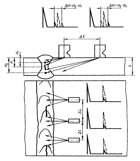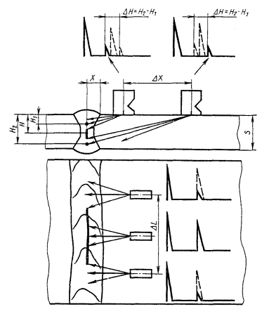 Условную высоту DН в миллиметрах (или в микросекундах) измеряют как разность значений глубин (H2, Н1) расположения дефекта в крайних положениях преобразователя, перемещаемого перпендикулярно шву.