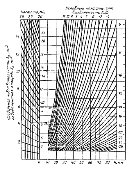 Чувствительность, характеризуемая минимальной эквивалентной площадью (в мм2) отражателя, который еще обнаруживается на заданной глубине в изделии при данной настройке аппаратуры |