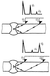 соотношение амплитуд эхо-сигнала U1, отраженного от выявленного дефекта, и эхо-сигнала U2, претерпевшего зеркальное отражение от внутренней поверхности (черт. 2);
