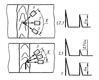 сравнение угла g между крайними положениями преобразователя, соответствующими уменьшению максимальной амплитуды эхо-сигнала от края дефекта Um в два раза, со значением g0, установленным технической документацией на контроль.