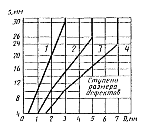 8. В зависимости от отношения эквивалентного диаметра D выявленного дефекта к толщине s свариваемого металла установлены четыре ступени размера дефектов, которые определяют по черт. 4.