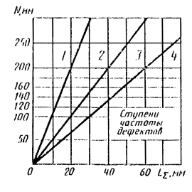 9. В зависимости от отношения суммарной протяженности дефектов LS на оценочном участке к длине оценочного участка l установлены четыре ступени частоты дефектов, которые определяют по черт. 5.