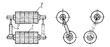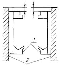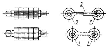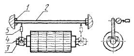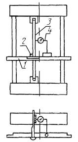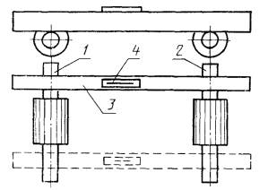 2. ПРОВЕРКА ГЕОМЕТРИЧЕСКОЙ ТОЧНОСТИ ЛЕСОПИЛЬНОЙ РАМЫ2.1. Перед проверкой рама должна быть установлена по уровню. Допуск на установку не должен превышать 0,1 мм на длине 1000 мм. Общие требования к испытаниям лесопильных рам на точность - по ГОСТ 25338. 2.2. Горизонтальность осей нижних подающих вальцов Допуск горизонтальности 0,2 мм на длине 1000 мм. Проверка проводится в соответствии со схемой, указанной на черт. 1. На валу подающего вальца 1 устанавливают специальный мостик 2 с призматическими основаниями и уровень 3. Измерения проводят поочередно на переднем и заднем нижних подающих вальцах. Отклонение от горизонтальной плоскости определяют по наибольшему показанию уровня. 2.3. Расположение осей нижних подающих вальцов в одной горизонтальной плоскости Допуск горизонтальности 0,4 мм на длине 1000 мм. Проверка проводится в соответствии со схемой, указанной на черт. 2. На шейки 1 и 2 переднего и заднего нижних подающих вальцов устанавливают поверочную линейку 3, на которой размещают уровень 4. Измерения проводят в двух положениях. Отклонения определяют по наибольшему показанию уровня. 2.4. Параллельность осей нижних и верхних подающих вальцов в горизонтальной плоскости Допуск параллельности 0,3 мм на длине 1000 мм. Проверка проводится в соответствии со схемой, указанной на черт. 3. Микрометрический нутромер 2 устанавливают между валами нижних подающих вальцов 1 (верхних подающих вальцов 3) в точках, наиболее удаленных друг от друга по длине вала. Отклонение параллельности равно алгебраической разности показаний нутромера. 2.5. Параллельность осей нижних и верхних передних и задних подающих вальцов в вертикальной плоскости Допуск параллельности 0,5 мм на длине 1000 мм. Проверка проводится в соответствии со схемой, указанной на черт. 4. Микрометрический нутромер 2 устанавливают между валами нижнего 1 и верхнего 3 задних подающих вальцов (передних подающих вальцов) в точках, наиболее удаленных друг от друга по длине вала. Отклонение от параллельности равно алгебраической разности показаний нутромера. 2.6. Параллельность установочной линейки оси переднего нижнего подающего вальца Допуск параллельности 0,3 мм на длине 1000 мм. Проверка проводится в соответствии со схемой, указанной на черт. 5. На валу переднего нижнего подающего вальца 3 на стойке 4 со специальной призмой устанавливают индикатор 5 так, чтобы его измерительный наконечник касался рабочей грани поверочной линейки 2 (закрепленной на платиках 1) и был перпендикулярен к ней. Вертикальное положение стойки индикатора проверяют по уровню. Измерения проводят в точках, наиболее удаленных друг от друга. Отклонение от параллельности равно алгебраической разности показаний индикатора. 2.7. Вертикальность перемещения пильной рамки Допуск вертикальности 0,35 мм на длине 1000 мм. Проверка проводится в соответствии со схемой, указанной на черт. 6. На базовой поверхности лесопильной рамы устанавливают линейку 1 для установки пил с закрепленным на ней специальным угольником 2. В пильной рамке, поднятой в крайнее верхнее положение, закрепляют контрольную полосу 3 так, чтобы по всей ширине прилегала она к рабочей грани треугольника. Точность вертикального закрепления контрольной полосы 0,05 мм на длине 1000 мм проверяют рамным уровнем. На линейке устанавливают индикатор 4 так, чтобы его измерительный наконечник касался