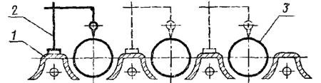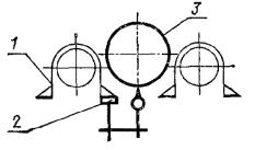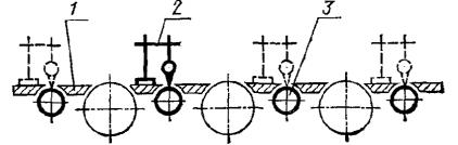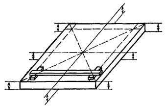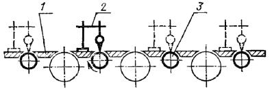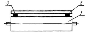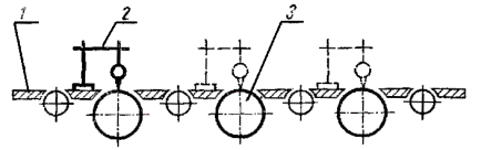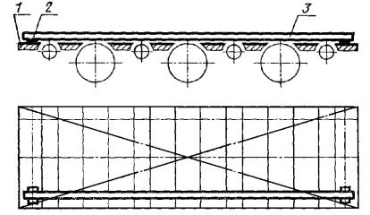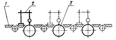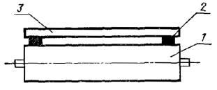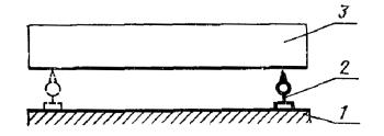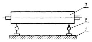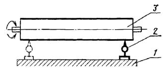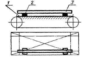 Постановлением Государственного комитета стандартов Совета Министров СССР от 13 февраля 1978 г. № 443 срок действия установлен с 01.07.1979 г. до 01.07.1984 г. Настоящий стандарт распространяется на плоскошлифовальные цилиндровые станки с конвейерной и с вальцовой подачей, предназначенные для шлифования пластей плит, листового материала и рамочных конструкций из древесины. Стандарт устанавливает дополнительные требования к общим условиям испытаний станков на точность по ГОСТ 25338-82. (Измененная редакция, Изм. № 1). Погрешность выверки станка по уровню не должна быть более 0,15 мм/м. 1. ПРОВЕРКА ТОЧНОСТИ ПЛОСКОШЛИФОВАЛЬНОГО ЦИЛИНДРОВОГО СТАНКА С КОНВЕЙЕРНОЙ ПОДАЧЕЙ И ВЕРХНИМ РАСПОЛОЖЕНИЕМ ЦИЛИНДРОВПроверка 1.1. Плоскостность рабочей поверхности конвейера Допуск 0,5 на длине 1000 мм. Метод проверки На рабочей поверхности конвейера 1 в продольных, поперечных и диагональных направлениях на двух опорах 2 одинаковой высоты (плоскопараллельных концевых мерах длины) устанавливают поверочную линейку 3. Просвет между проверяемой поверхностью конвейера и рабочей поверхностью поверочной линейки измеряют щупом. Отклонение определяют как наибольшую разность результатов измерений в каждом направлении. Проверка 1.2. Прямолинейность рабочей поверхности опорных балок Допуск 0,1 мм на длине 1000 мм. Метод проверки К рабочей поверхности опорных балок 1 в продольном направлении на двух опорах 2 одинаковой высоты (плоскопараллельных концевых мерах длины) прикладывают поверочную линейку 3. Просвет между проверяемой поверхностью опорных балок и рабочей поверхностью поверочной линейки измеряют щупом. Отклонение от прямолинейности определяют как наибольшую разность результатов измерений. Проверка 1.3. Расположение рабочих поверхностей опорных балок в одной плоскости Допуск 0,1 мм на длине 1000 мм. Метод проверки К рабочим поверхностям крайних опорных балок 1 в продольных и диагональных направлениях на двух опорах 2 одинаковой высоты (плоскопараллельных концевых мерах длины) прикладывают поверочную линейку 3. Просвет между проверяемой поверхностью опорных балок и рабочей поверхностью поверочной линейки измеряют щупом. Отклонение от плоскости определяют как наибольшую разность результатов измерений в каждом направлении. Проверка 1.4. Параллельность рабочей поверхности конвейера опорным балкам Допуск 0,5 мм на длине 1000 мм. Метод проверки На рабочую поверхность конвейера 1 устанавливают измерительный прибор 2 так, чтобы его измерительный наконечник касался рабочей поверхности опорной балки 3 и был перпендикулярен ей. Измерения производят в двух крайних положениях по длине опорных балок. Отклонение от параллельности определяют как наибольшую алгебраическую разность показаний измерительного прибора в двух крайних положениях по длине опорных балок. Проверка 1.5. Радиальное биение цилиндрической поверхности верхних вальцов Допуск 0,05 мм. Метод проверки На рабочую поверхность конвейера 1 устанавливают измерительный прибор 2 так, чтобы его измерительный наконечник касался нижней образующей вальца 3 и был перпендикулярен ей в плоскости измерения. Намерения производят в двух крайних сечениях по длине каждого вальца. Радиальное биение определяют как наибольшую величину алгебраической разности показаний показывающего измерительного прибора в одном из его поло