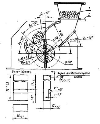 Для определения износостойкости материала рабочих органов дробилки из них или из специальных заготовок одной плавки и садки (размером не менее 40×80×140 мм) путем разрезки на анодно-механическом или электроискровом станке изготовляют била-образцы, которые должны быть отшлифованы и предварительно изношены согласно чертежу настоящего приложения.