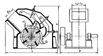 Постановлением Государственного комитета стандартов Совета Министров СССР от 1 декабря 1971 г. № 1957 срок введения установлен с 01.01.73 Проверен в 1984 г. Постановлением Госстандарта от 19.12.84 № 4696 срок действия продлен до 01.01.90 Настоящий стандарт распространяется на однороторные дробилки, предназначенные для среднего и мелкого дробления известняка, доломита, мергеля, мрамора, гипса, руд малой абразивности и других подобных материалов. Стандарт не распространяется на дробилки для дробления пластичных материалов, склонных к налипанию, и для дробления с сушкой. Установленные настоящим стандартом показатели технического уровня дробилок соответствуют требованиям высшей и первой категорий качества. (Измененная редакция, Изм. № 2). CОДЕРЖАНИЕ 1. ТИПОРАЗМЕРЫ И ОСНОВНЫЕ ПАРАМЕТРЫ1.1. Типоразмеры и основные параметры дробилок должны соответствовать указанным на чертеже и в табл. 1.