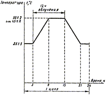 * Допускается (95±3) %. Если основной целью испытания является проверка воздействия ультрафиолетовой части спектра, испытание проводят следующим образом. Изделия помещают в камеру, включают источники инфракрасного и ультрафиолетового излучения, после чего температуру воздуха в камере (в тени) устанавливают (55±2) °С - для изделий, у которых в нормативно-технической документации установлено рабочее и предельное рабочее значение температуры, (45±2) °С - для изделий, у которых в нормативно-технической документации установлено только рабочее значение температуры. Облучение образцов производят в течение 120 ч непрерывно или с перерывами. Если основной целью испытания является проверка воздействия ультрафиолетовой части спектра совместно с нагревом, испытание проводят по режиму, график которого указан на черт. 1, при этом продолжительность испытания составляет 10 циклов. Черт. 1 (Измененная редакция, Изм. № 1, 3). 6.10.3. По окончании испытания изделия вынимают из камеры, производят внешний осмотр их и сравнение с изделиями, не подвергавшимися облучению, а также измерение параметров, указанных в технических заданиях или стандартах на изделия. Контролю подлежат только те параметры, стабильность которых зависит от состояния конструктивных деталей или узлов из органических материалов или имеющих органические покрытия и подвергающихся непосредственному облучению. 6.10.4. Изделия считают выдержавшими испытания, если после испытаний они удовлетворяют требованиям, установленным в техническом задании или стандартах на изделия для данного вида испытаний. 6.11. Испытание на динамическое воздействие пыли 6.11.1. Испытание проводят с целью проверки устойчивости изделий к разрушающему (абразивному) воздействию пыли. 6.11.2. Изделия помещают в камеру пыли и располагают таким образом, чтобы воздействие пыли было наиболее эффективным и соответствовало возможному воздействию пыли в условиях эксплуатации. Способ установки изделий указывают в стандартах на изделия или в программе испытаний. 6.11.3. Температура воздуха в камере должна быть 55 °С при относительной влажности не более 50 %. 6.11.4. Испытание проводят обдуванием изделий просушенной пылевой смесью, содержащей 70 % кварцевого песка, 15 % мела и 15 % каолина в количестве, равном примерно 0,1 % от объема камеры, со скоростью 10 - 15 м/с, в течение 1 ч. Размер частиц должен быть таков, чтобы они проходили без остатка через сито с сеткой № 0224 по ГОСТ 6613-86 и оставляли остаток около 3 % на сите с сеткой № 02. 6.11.5. По окончании испытания изделия извлекают из камеры, удаляют пыль с наружных поверхностей и производят внешний осмотр изделий. 6.11.6. Изделия считают выдержавшими испытание, если их внешний вид удовлетворяет требованиям, оговоренным в технических заданиях или стандартах на изделия. 6.12. Испытание на пыленепроницаемость 6.12.1. Испытание проводят с целью проверки способности конструкций корпусов (кожухов) изделий не пропускать пыли. 6.12.2. Изделия помещают в камеру пыли и располагают таким образом, чтобы воздействие пыли было наиболее эффективным и соответствовало возможному воздействию пыли в условиях эксплуатации. Способ установки изделий указывают в стандартах на изделия или программе испытаний. 6.12.3. Изделия подвергают воздействию пылевой смеси, находящейся во взвешенном состоянии в воздухе камеры в течение 15 мин. З