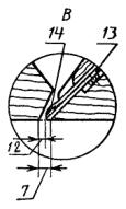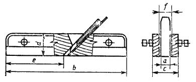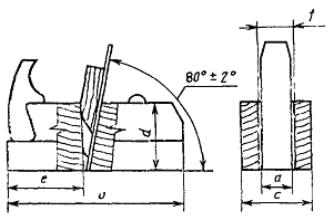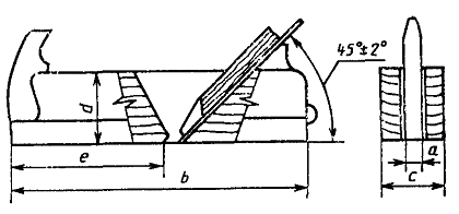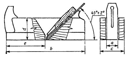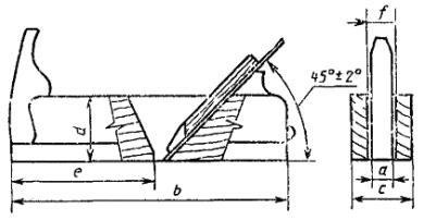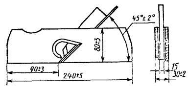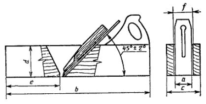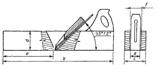 Рубанок зензубель (черт. 19) Черт. 19 Рубанок фальцгебель (черт. 20) Черт. 20 Рубанок калевка (черт. 21) Черт. 21 Рубанок шпунтубель (черт. 22) Черт. 22 2. ТЕХНИЧЕСКИЕ ТРЕБОВАНИЯ2.1. Характеристики 2.1.2. Основные детали рубанков должны изготовляться из следующих материалов: колодка - из древесины двух различных пород, тщательно склеенной, с высоким показателем твердости для подошвы для уменьшения износа во время работы; подошва колодки - из древесины граба, клена, белой акации, ясеня или бука по ГОСТ 2695; допускается по согласованию с потребителем подошву колодки изготовлять из древесины березы; толщина подошвы колодки должна быть не менее 12 мм с расположением волокон вдоль продольной оси колодки рубанка; накладка колодки - из древесины, предусмотренной для изготовления подошвы колодки и из древесины березы, ильма, береста по ГОСТ 2695. Колодки рубанков допускается изготовлять цельными из древесины, предусмотренной для изготовления подошвы колодки. Ножи - из двухслойной стали: основной слой - из стали марки 30 по ГОСТ 1050, марок У8, У8А, У9 по ГОСТ 1435; плакирующий слой - из стали марок 9ХФ, 9Х5ВФ, Х6ВФ, 9ХС по ГОСТ 5950 или из других марок стали, не уступающих по стойкости ножам, изготовленным из сталей, указанных выше. Допускается изготовление цельных ножей из стали марок 9ХФ, 9Х5ВФ, Х6ВФ, 9ХС по ГОСТ 5950; марок У8, У8А, У9 по ГОСТ 1435 или из других марок стали, не уступающих по стойкости ножам, изготовленным из сталей, указанных выше. Материалы для изготовления деталей рубанков, неуказанных выше и требования к ним - в соответствии с рабочими чертежами. 2.1.3. Древесина для деталей рубанка должна быть без трещин, гнили, прорости, червоточин, хорошо высушена (содержание влаги от 10 до 12 %) во избежание коробления. Остальные дефекты и пороки древесины не должны превышать норм, установленных для пиломатериалов 1-го сорта по ГОСТ 2695. 2.1.4. Сучки не допускаются на подошве колодки, роговой рукоятке, упоре, клине, а также на боковых и торцовых поверхностях колодки и в летке на расстоянии 15 мм от рабочей поверхности. На остальных поверхностях колодки допускаются несквозные здоровые сросшиеся сучки. Нос рубанка не должен иметь острых углов, которые могут врезаться в поверхность, подвергаемую строганию. Предел прочности клеевого соединения должен быть не менее 4 МПа. 2.1.6. Шероховатость рабочей поверхности подошвы - не более Rm max 32 по ГОСТ 7016. 2.1.7. Допуск плоскостности рабочей поверхности подошвы колодки рубанка не должен превышать: у рубанков с двойным ножом - 0,08 мм на 100 мм длины; у фуганков и полуфуганков - 0,1 мм на 200 мм длины; у остальных рубанков - 0,12 мм на 100 мм длины. 2.1.9. Твердость цельных ножей и плакирующего слоя должна быть 58...63 HRCэ на участке длиной не менее 45 мм от режущей кромки. для шерхебелей и рубанков с одиночным ножом - от 0,5 до 4; для остальных рубанков - от 0,5 до 2. Лакокрасочное покрытие должно соответствовать III классу по ГОСТ 9.032, условия эксплуатации - У3 по ГОСТ 9.104. Допускается по согласованию с потребителем пропитка деревянных деталей олифой. 2.1.14. Поверхности металлических деталей должны иметь металлические или неметаллические неорганические покрытия по ГОСТ 9.306, ГОСТ 9.301, группа условий эксплуатации 3 по ГОСТ 15150. Допускается отсутствие покрытия на поверхностях ножа, образующих режущую кромку. для рубанков с шириной ножа 50 мм и более - 135; » » » » » от 30 до 50 мм - 75; » » » » » менее 30 мм