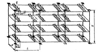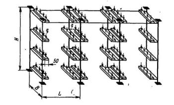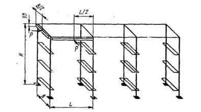 Черт. 2 2.6. На поверхностях деталей стеллажей не допускаются трещины, плены, расслоения, закаты и заусенцы. 2.7. Параметр шероховатости по ГОСТ 2789-73 обработанных металлических поверхностей должен быть Ra ≥ 50 мкм. (Измененная редакция, Изм. № 1). 2.8. Типы и конструктивные элементы швов сварных соединений - по ГОСТ 8713-79, ГОСТ 5264-80, ГОСТ 11533-75, ГОСТ 11534-75, ГОСТ 14771-76. Места, подлежащие сварке, должны быть очищены от загрязнений, масла, окалины и коррозии. 2.9. В швах сварных соединений не допускаются: непровары; местные наплывы; поры и шлаковые включения диаметром более 1 мм; подрезы основного металла более 0,5 мм; трещины всех видов. 2.10. Размеры деталей и сборочных единиц стеллажей должны быть выполнены с допускаемыми отклонениями не грубее 14 квалитета по ГОСТ 25347-82. 2.11. Рамы стеллажей допускается изготовлять из двух и более разъемных частей по высоте. 2.12. Поверхность стеллажей должна быть загрунтована и окрашена в серый или серебристый цвет. Лакокрасочные покрытия должны удовлетворять по внешнему виду V классу ГОСТ 9.032-74, по условиям эксплуатации - группе У2 ГОСТ 9.104-79. Допускается по согласованию с потребителем изготовлять стеллажи только загрунтованными. Крепежные детали должны иметь защитное покрытие по ГОСТ 9.306-85. (Измененная редакция, Изм. № 1). 2.13. Неперпендикулярность стоек стеллажей в собранном виде без нагрузки к горизонтальной плоскости стеллажей не должна быть более 1 мм на 1000 мм длины, а под действием горизонтальной нагрузки не должна быть более 4 мм на 1000 мм длины и 6 мм на всей длине. Неперпендикулярность опорной поверхности ячеек к стойкам стеллажа без нагрузки не должна быть более 5 мм на 1000 мм длины. 2.14. Стеллажи следует испытывать на прочность и устойчивость действием вертикальной и горизонтальной нагрузок. 3. ТРЕБОВАНИЯ БЕЗОПАСНОСТИ3.1. Конструкция стеллажей и деталей их крепления должна обеспечивать жесткость, прочность, устойчивость, безопасность и удобство выполнения монтажных и ремонтных работ. Элементы стеллажей не должны иметь острых углов, кромок и поверхностей с неровностями. 3.2. Стеллажи должны иметь защитное заземление по ГОСТ 12.2.007.0-75. 4. КОМПЛЕКТНОСТЬ4.1. В комплект стеллажей должны входить детали и сборочные единицы, количество которых указано на рабочих чертежах. 4.2. К каждому стеллажу должны быть приложены инструкции по монтажу и эксплуатации, а также паспорт по ГОСТ 2.601-68. 5. ПРАВИЛА ПРИЕМКИ5.1. Для проверки соответствия стеллажей требованиям настоящего стандарта предприятие-изготовитель должно проводить приемо-сдаточные и периодические испытания. 5.2. При приемо-сдаточных испытаниях на соответствие требованиям пп. 2.1-2.14 должны проверяться сборочные единицы в детали стеллажей каждого типа, отобранные выборочно в количестве, необходимом для сборки трехсекционного стеллажа. 5.3. Периодические испытания на соответствие требованиям пп. 2.1-2.14 следует проводить один раз в год. Периодическим испытаниям подвергают сборочные единицы и детали стеллажей каждого типа, отобранные выборочно в количестве, необходимом для сборки трехсекционного стеллажа и прошедшие приемо-сдаточные испытания. 5.4. Результаты приемо-сдаточных испытаний отражают в паспорте на стеллаж. Результаты периодических испытаний оформляют протоколом по ГОСТ 15.001-88. 6. МЕТОДЫ ИСПЫТАНИЯ6.1. Качество материалов и поверхностей защитных покрытий деталей стеллажей 