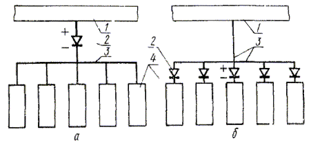 1 - защищаемое подземное сооружение; 2 - полупроводниковый диод (в контрольно-измерительном пункте); 3 - провод; 4 - протектор Черт. 2 2. РАСЧЕТ ПАРАМЕТРОВ ДЛЯ УСТАНОВКИ ПОЛЯРИЗОВАННЫХ ПРОТЕКТОРОВ2.1. Суммарный ток, необходимый для защиты подземных сооружений в зоне знакопеременных блуждающих токов, определяют в каждом конкретном случае с помощью опытной катодной станции. При проектировании новых сооружений расчетные величины защитного тока следует задавать с учетом специфики подземного сооружения. 2.2. Силу тока (iпр) в амперах одиночных поляризованных протекторов, а также групповых с диодом на каждом протекторе (см. черт. 2б) вычисляют на основе измеренных величин максимальных анодных потенциалов «сооружение-земля» и электрического сопротивления цепей защиты по формуле: