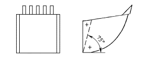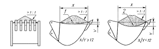 1.3.2.4. Ковш с непрямолинейной режущей кромкой (см. черт. 12). Режущая кромка такого ковша должна выступать за поперечную линию, соединяющую передние углы боковых стенок, и не должна являться прямолинейной в поперечном направлении. Задняя стенка не должна выступать за поперечную прямую, соединяющую задние углы боковых стенок. Разделительная плоскость должна проходить в передней части ковша через воображаемую поперечную прямую, проведанную па расстоянии 1/3 высоты выступа передней кромки, а в задней части - через прямую, идущую вдоль верхнего края задней стенки.