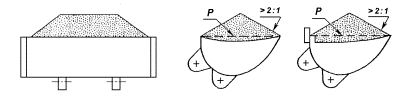 Примечание. При вычислении геометрической вместимости ковшей местные выступы (зубья ковша, держатели зубьев, удлинители боковых и задних стенок или режущих кромок) не учитывают. 1.3. Номинальную вместимость ковша Vном в м3 для ковша прямой лопаты, обратной лопаты с одной открытой стороной, погрузочного и грейферного вычисляют как сумму геометрической вместимости ковша Vг и объема “шапки” Vш по формуле Vном = Vг + Vш (3) Номинальную вместимость ковша Vном в м3 для ковша обратной лопаты с двумя открытыми сторонами и драглайна определяют объемом, ограниченным внутренними поверхностями днища, стенок и плоскостью, образованной откосом грунта под углом 75° к горизонтали, а также поверхностью, образованной перемещением прямой, перпендикулярной к плоскости симметрии ковша по профилю другой открытой стороны ковша. При этом задние грани боковых стенок обратной лопаты должны находиться в вертикальном положении (черт. 5), а днище ковша драглайна должно находиться в горизонтальном положении (черт. 6). Примечание. При вычислении номинальной вместимости ковшей местные выступы (зубья ковша, держатели зубьев, удлинители боковых и задних стенок или режущих кромок) не учитывают. Исключением является погрузочный ковш, у которого учитывают козырек задней стенки, но без защитного козырька. 1.3.1. Объем “шапки” Vш - объем материала, лежащего на разделительной плоскости Р (или разделительной поверхности) с уклоном 1:1 (45°) в ковшах типа “обратная лопата” (черт. 2) и с уклоном 2:1 (26°) в ковшах оборудования прямого копания и погрузочного (черт. 1, 3). 1.3.2. Геометрическую вместимость ковша и объем “шапки” грунта для погрузочных ковшей с непрямолинейной боковой кромкой и соотношением размеров Х/У более 12 (см. рекомендуемое приложение) в зависимости от формы и расположения задней стенки и режущей кромки определяют по черт. 9 - 13 и формулам (4)-(10). 1.3.2.1. Основной ковш (см. черт. 9). Задняя стенка основного ковша не должна выступать за поперечную прямую, соединяющую задние углы боковых стенок, а режущая кромка не должна выступать за поперечную прямую, соединяющую передние углы боковых стенок. Разделительная плоскость должна проходить в задней части ковша через прямую, идущую вдоль верхнего края задней стенки, а в передней части ковша - через прямую, идущую вдоль верхнего края режущей кромки. 1.3.2.2. Ковш с выступающей прямолинейной кромкой (см. черт. 10) Режущая кромка такого ковша должна быть прямолинейна в поперечном направлении и выступать за поперечную прямую, соединяющую передние углы боковых стенок, а задняя стенка не должна выступать за поперечную линию, соединяющую задние углы боковых стенок.
