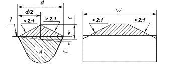 Геометрическую вместимость ковша Vг в м3 для ковша обратной лопаты с двумя открытыми сторонами и драглайна следует определять как объем, ограниченный внутренними поверхностями днища, стенок и поверхностью, образованной перемещением прямой, перпендикулярной к плоскости симметрии ковша по профилю его открытых сторон, по формуле где А - площадь сечения внутреннего объема ковша, м2; W - средняя ширина внутреннего объема ковша, м. 1.2.1. Среднюю ширину внутреннего объема ковшей W в м полукруглой формы определяют по черт. 7 и формуле (2); ковшей трапецеидальной формы - измеряют на расстоянии, составляющем 2/3 высоты ковша (черт. 8). Ковш полукруглой формы