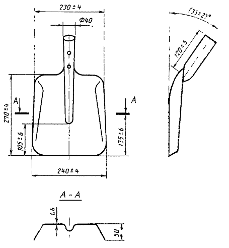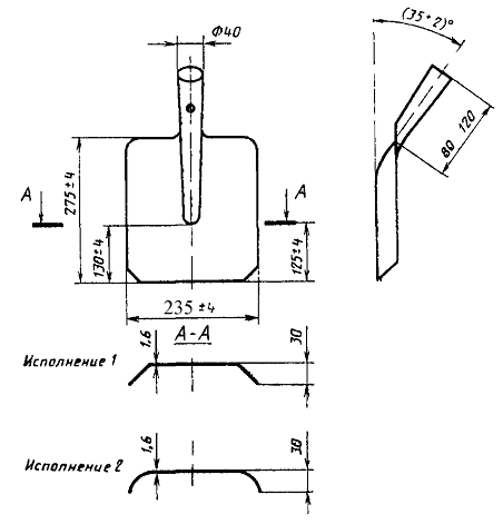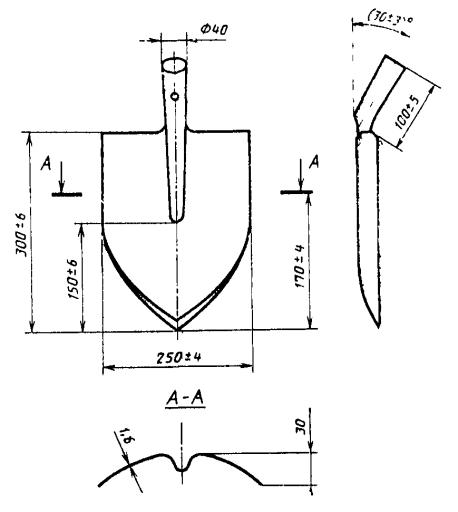 2.32. Упаковка изделий, отгружаемых в районы Крайнего Севера и отдаленные районы, - по ГОСТ 15846-79. 3. ПРИЕМКА3.1. Для проверки соответствия лопат требованиям настоящего стандарта следует проводить приемо-сдаточные и периодические испытания. 3.2. Лопаты к приемке предъявляют партиями. Партией считают лопаты, изготовленные за одну смену и предъявленные к приемке по одному документу. 3.3. Приемо-сдаточные испытания следует проводить в следующем объеме: на соответствие требованиям пп. 2.4; 2.7; 2.12 - 2.19; 2.25 и 2.26 - 100 % изделий, на соответствие требованиям пп. 2.3 (до окраски); 2.5; 2.6 (до окраски); 2.9 - 2.11 (2.9 - до сборки с черенком); 2.20; 2.21; 2.24; 2.26 - 0,1 % лопат и 0,5 % черенков от принимаемой партии, но не менее 5 шт. Результаты выборочной проверки распространяют на всю партию. 3.4. Периодические испытания следует проводить не реже раза в квартал в объеме приемо-сдаточных испытаний с дополнительным контролем требований пп. 2.1; 2.2; 2.8; 2.22 и 2.24. Для периодических испытаний отбирают 1 % лопат от партии, но не менее 10 шт. 3.5. При получении неудовлетворительных результатов проверки хотя бы по одному из показателей следует проводить повторную проверку удвоенного количества лопат, взятых из той же партии. Результаты повторной проверки являются окончательными. 4. МЕТОДЫ КОНТРОЛЯ4.1. Внешний вид лопат и прочность соединений (пп. 2.4; 2.7; 2.12 - 2.19; 2.25) следует проверять визуально сравнением с образцами-эталонами. 4.2. Проверку размеров лопат, предельных отклонений размеров, угла заострения и толщины режущей кромки (пп. 2.1; 2.5; 2.6; 2.9 - 2.11) следует проводить универсальным измерительным инструментом или шаблонами. Проверку отклонения поверхности полотен лопат от номинальной следует проводить в крайних точках сечения А-А, указанного на черт. 2 - 16. 4.3. Твердость полотна лопаты (п. 2.3) следует определять по ГОСТ 9013-59 в 5 точках, удаленных от кромки полотна на 15 - 50 мм и равномерно расположенных по периметру. 4.4. Прочность полотна лопаты проверяют в приспособлении, зажимающем полотно на расстоянии 115 мм от режущей кромки. Полотно лопаты