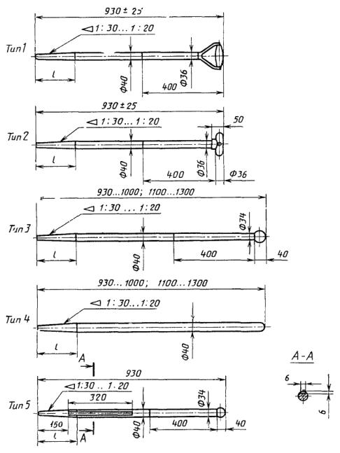 Примечания: 1. Допускается изготовлять черенки для садово-огородных лопат диаметром 35 мм. 2. Для лопат типов ЛОВ и ЛОУ допускается изготовлять черенки без конусной части. 3. Допускается изготовлять конусные посадочные места черенков для садово-огородных лопат с 2 углами наклона. (Измененная редакция, Изм. № 1). Пример условного обозначения лопаты типа ЛКО, с черенком типа 4, длиной 1300 мм: ЛКО-4-1300 ГОСТ 19596-87 То же, типа ЛОУ, исполнения 1, шириной 210 мм, с черенком типа 1: ЛОУ-1-210-1 ГОСТ 19596-87 2. ТЕХНИЧЕСКИЕ ТРЕБОВАНИЯ2.2. Детали лопат должны быть изготовлены из следующих материалов: полотно и тулейка - прокат тонколистовой из стали марок 30ХГС по ГОСТ 4543-71, 45, 50 по ГОСТ 1050-74, БСт5, БСт6 по ГОСТ 380-88 или других марок по физико-механическим показателям не ниже указанных; вилка и тулейка - прокат тонколистовой из стали марок 10, 15, 20 по ГОСТ 1050-174 или БСт2, БСт3 по ГОСТ 380-88; стержень - сталь БСт0, БСт2, БСт3 по ГОСТ 380-88; черенок и рукоятка - пиломатериалы лиственных пород 1-го сорта: береза, ясень, клен по ГОСТ 2695-83. Примечания: 1. Допускается изготовлять рукоятки и вилки из пластмассы по ГОСТ 16338-85. 2. Допускается изготовлять черенки, кроме черенков типа 5, из других материалов в соответствии с требованием п. 2.23. 3. Тонколистовой прокат из стали марок БСт5, БСт6, 10, 15, 20, 45 и 50 должен соответствовать требованиям ГОСТ 16523-70, 30ХГС по ТУ 14-1-4118-86. 4. Допускаемые отклонения по толщине тонколистового проката должны соответствовать требованиям ГОСТ 19903-74 и ГОСТ 19904-74.
