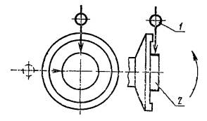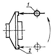 Черт. 1. Допуск 0,04 мм. Метод проверки На каретку устанавливают показывающий измерительный прибор 1 так, чтобы его измерительный наконечник касался поверхности посадочной шейки пильного вала 2. Биение определяют как наибольшую алгебраическую разность показаний измерительного прибора в каждом его положении. Проверка 1.2. Торцовое биение поверхности опорной шайбы пильного вала