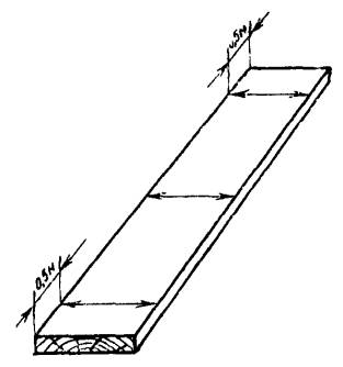 Черт. 7 Допуск 0,4 мм на длине 1000 мм. Метод проверки В плоскостях АА и А1А1 измеряют микрометрическим нутромером расстояние между вальцами. Отклонение равно наибольшей разности результатов по длине измерения. (Новая редакция, Изм. № 1). 2. ПРОВЕРКА СТАНКА В РАБОТЕПроверка 2.1. Соответствие ширины выпиливаемых досок заданному размеру Черт. 8 Допуск при ширине доски: до 100 мм.................... ±2,0 мм; св. 100 мм................... +3,0; -2,0 мм. Метод проверки На станке выпиливают доски. Ширину обработанных досок измеряют в трех сечениях, указанных на черт. 8. (Измененная редакция, Изм. № 1). Проверка 2.2. Перпендикулярность поверхности пропила пласти доски