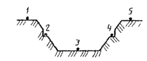 (Измененная редакция, Изм. № 1, 2). 2.4.10.3; 2.4.10.4. (Исключены, Изм, № 2). 2.4.10.5. Техническую производительность экскаватора проверяют при прокладке канала в грунтовых условиях, соответствующих требованиям эксплуатационной документации. Данные о грунтовых условиях должны быть взяты из проекта водохозяйственного объекта, на котором проходит испытания экскаватор. Методы контроля содержания камней в грунте и размеры камней - по ГОСТ 20915-75. Определение влажности грунта и песчано-гравийного фильтра - по ГОСТ 5180-84. Техническую производительность следует определять при полной загрузке двигателя на той скорости вращения рабочих органов, которые обеспечивают в грунтах данной категории наибольшую производительность. Техническую производительность следует определять в грунтах II категории при отрывании оросительных каналов и в торфяных грунтах при отрывании осушительных каналов. Категорию грунта следует определять по приложению 1 ГОСТ 17343-81 с помощью динамического плотномера (см. обязательное приложение 1), измерения которым выполняют в пяти поперечных сечениях канала (см. черт. 2), равномерно расположенных через 10 м по длине канала. За результат измерений принимают среднее арифметическое всех измерений. Черт. 2 Техническую производительность определяют за 1 ч непрерывной работы при установившемся режиме работы экскаватора после отрытия не менее 5 м канала. Время непрерывной работы измеряют секундомером класса точности 3,0. Техническую производительность определяют как среднее арифметическое из производительностей, полученных за контрольный час работы в каждом из трех смен. Объем извлеченного за это время грунта в м3 определяют по формуле