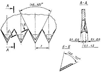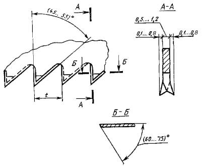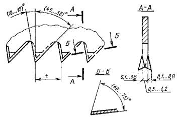 Пример условного обозначения ножовки с полотном типа 1, исполнения 1, длиной режущей части полотна 500 мм, с шагом зубьев 5 мм: 1-1-500-5 ГОСТ 26215-84 (Измененная редакция, Изм. № 1). 2. ТЕХНИЧЕСКИЕ ТРЕБОВАНИЯ2.2. Полотно ножовки должно изготовляться из стали марок 8ХФ, 9ХФ, 9ХС по ГОСТ 5950-73, или из стали марок У7, У7А, У8, У8А, У8Г, У8ГА, У9А, У10 по ГОСТ 1435-74, или из стали марок 65Г, 60С2А по ГОСТ 14959-79. Допускается изготовление полотен из других марок сталей по физико-механическим свойствам не ниже указанных. Допускается изготовление полотен из ленты стальной светлокаленой, полированной или колоризованной по ГОСТ 21996-76. (Новая редакция, Изм. № 1). 2.3. Ручки должны изготовляться из одного из перечисленных материалов: фенопласта марки 03-010-02 по ГОСТ 5689-79; полиэтилена высокой плотности по ГОСТ 16338-85; пиломатериалов твердых лиственных пород 1-го сорта по ГОСТ 2695-83; сплавов алюминиевых литейных марок АЛ2, АЛ9 по ГОСТ 2685-75; стали любой марки по ГОСТ 380-88 или ГОСТ 1050-74. Допускается изготовление ручек из других материалов, по механическим свойствам не ниже указанных. (Измененная редакция, Изм. № 1). 2.4. На полотне не должно быть трещин, расслоений, волосовин, выкрошенных мест, коррозии. Острые кромки (кроме режущей части) должны быть притуплены. Допускаются следы рихтовки глубиной не более 0,05 мм. Требования к внешнему виду полотна ножовок, изготовленных из стальной ленты, - по ГОСТ 21996-76. (Измененная редакция, Изм. № 1). 2.5. Твердость полотна ножовки должны быть 42...52 HRCэ. 2.6. Параметр шероховатости поверхностей полотна ножовок должен быть не более Ra 1,25 мкм по ГОСТ 2789-73, а изготовленных из стальной ленты - по ГОСТ 21996-76. (Новая редакция, Изм. № 1). 2.7. Допуск прямолинейности полотна ножовки должен быть: 0,2 мм - в поперечном направлении и на 100 мм длины в продольном направлении; 0,3 мм - то же, для ножовок первой категории качества. Требования к прямолинейности полотна ножовок, изготовленных из стальной ленты, - по ГОСТ 21996-76. (Измененная редакция, Изм. № 1). 2.8. Зубья ножовок должны быть заточены и разведены. Зуб должен быть заточен на протяжении не менее 2/3 его высоты от вершины. Зубья ножовок с шагом до 3 мм включительно должны иметь прямую заточку передней и задней грани зуба. Допускается неполный профиль крайних зубьев (по одному с каждой стороны) и по пять зубьев с передней и задней сторон не затачивать и не разводить. Развод зубьев производят поочередным отгибанием их в разные стороны на величину (на одну сторону), мм: 0,1…0,3 для зубьев с шагом не более 3 мм; 0,3…0,6 « « « от 3,5 до 5,0 мм; 0,6…0,8 « « « 6,0 мм и более. (Новая редакция, Изм. № 1). Допускаются на поверхности ручек сросшиеся здоровые сучки диаметром не более 5 мм, в количестве не более 5 шт. (Измененная редакция, Изм. № 1). 2.11. Поверхность металлических ручек не должна иметь вмятин, сколов, заусенцев. 2.12. Полотно ножовки должно иметь защитное покрытие по ГОСТ 9.303-85 для группы условий эксплуатации 3 по ГОСТ 15150-69. Допускается светлое полотно ножовки изготовлять без защитного покрытия. (Новая редакция, Изм. № 1). Допускается ручки из металлических сплавов, не подвергающихся окислению, не окрашивать. Допускается другое покрытие, по защитным свойствам не ниже указанного. (Измененная редакция, Изм. № 1). 2.14. Поверхности деревянных ручек должны быть покрыты лаком группы 7 по ГОСТ 9825-73, нитроцеллюлозным лаком НЦ-221 по ГОСТ 4976-83 или другими лаками по своим защитным свойства