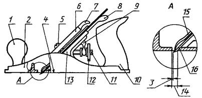 1 - ручка; 2 - корпус (колодка); 3 - зазор; 4 - подошва; 5 - винт крышки ножа; 6 - крышка ножа; 7 - затвор крышки ножа; 8 - боковой регулировочный рычаг; 9 - регулировочный рычаг; 10 - рукоятка; 11 - регулировочный винт; 12 - регулировочная гайка; 13 - клин; 14 - проем; 15 - стружколом; 16 - нож Рисунок 1 Рисунок не определяет конструкцию Таблица 1 В миллиметрах