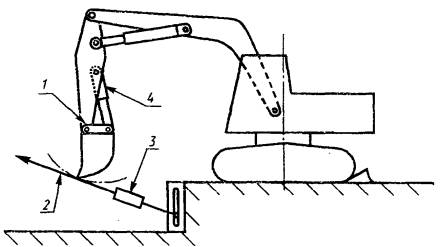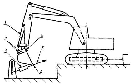 ПРИЛОЖЕНИЕ Б(рекомендуемое) МЕТОДЫ ИЗМЕРЕНИЯ УСИЛИЙ НА РАБОЧИХ ОРГАНАХИспытания проводят при работе машины в соответствии с указаниями изготовителя по эксплуатации и при соблюдении всех правил техники безопасности. Должны быть установлены страховочные цепи для предотвращения фактического опрокидывания машины при любом опыте, при котором лимитирующим фактором может оказаться ограничение по опрокидыванию. При работе двигателя с максимальной частотой вращения коленчатого вала, рекомендуемой изготовителем, включают отдельно нужный гидроцилиндр (цилиндры) и регистрируют усилие на кромке ковша или ином рабочем органе. Для получения оптимального положения, обеспечивающего максимальное усилие, проводят серию предварительных опытов при установке рукояти и ковша под разными углами друг к другу (т.е. при изменении хода поршня гидроцилиндра). Для каждого опыта отмечают лимитирующие факторы. В случае ограниченной возможности гидросистемы в протоколе указывают, в каком гидроконтуре или системе было превышено давление предохранительного клапана. В случае ограничения по опрокидыванию усилие на рабочем органе регистрируют после начала опрокидывания. Страховочные цепи не должны быть натянутыми, чтобы машина могла достигнуть граничного положения и была застрахована от опрокидывания. Если происходит скольжение, то машина должна быть заанкерена, а в результатах испытаний следует указать, что максимальное усилие достигнуто заанкериванием машины. Если имеется возможность варьирования положений шарниров стрелы, рукояти, рабочего органа и гидроцилиндров и (или) телескопической стрелы, то должны быть зарегистрированы относительные положения пальцев крепления стрелы, рукояти и ковша и положение телескопической стрелы при испытаниях. Для экскаваторов, снабженных выносными опорами, испытания проводят с поднятыми или опущенными опорами в зависимости от указаний их изготовителя. Каждое испытание проводят три раза и регистрируют максимальное усилие на рабочем органе для каждого опыта. В качестве результата испытаний указывают среднее арифметическое этих трех значений. Усилия на рабочем органе измеряют в соответствии с вышеизложенными общими требованиями. Экскаватор, оборудованный обратной лопатой Максимальное усилие на ковше обратной лопаты, развиваемое гидроцилиндром (цилиндрами ковша) Максимальное усилие - на кромке ковша при положении гидроцилиндра (цилиндров) ковша, обеспечивающем максимальный вращающий момент относительно шарнира крепления ковша. Кромка ковша должна перемещаться в направлении к базовой машине. Усилие измеряют по касательной к дуге, описываемой кромкой ковша вокруг шарнира ковша. Максимальное усилие на ковше обратной лопаты, развиваемое гидроцилиндром (цилиндрами) рукояти. Максимальное усилие - на кромке ковша при положении гидроцилиндра рукояти, обеспечивающем максимальный момент рукояти относительно шарнира крепления рукояти. Кромка ковша должна перемещаться в направлении к базовой машине. Ковш располагают в соответствии с рисунком 1, но ни одна часть ковша не должна находиться снаружи дуги, описываемой кромкой ковша относительно шарнира крепления рукояти. Усилие измеряют по касательной к этой дуге (рисунок 2). Экскаватор, оборудованный прямой лопатой Максимальное усилие прямого коп