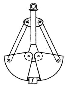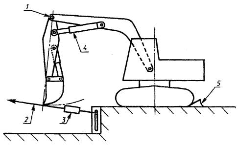 1 - гидроцилиндр ковша; 2 - альтернативные положения пальца; 3 - датчик нагрузки; 4 - шарнир крепления ковша; 5 - усилие на рабочем органе; 6 - кромка ковша Рисунок Б.1 - Гидравлический экскаватор, оборудованный обратной лопатой. Типовая схема измерения максимального усилия на ковше обратной лопаты, развиваемого гидроцилиндрами ковша 1 - альтернативные положения пальцев; 2 - гидроцилиндр рукояти; 3 - усилие на рабочем органе; 4 – датчик нагрузки Рисунок Б.2 - Гидравлический экскаватор, оборудованный обратной лопатой. Типовая схема измерения максимального усилия на ковше обратной лопаты, развиваемого гидроцилиндром рукояти 1 - шарнир крепления ковша; 2 - усилие на рабочем органе; 3 - датчик нагрузки; 4 - гидроцилиндр ковша Рисунок Б.3 - Гидравлический экскаватор, оборудованный прямой лопатой. Типовая схема измерения максимального усилия на ковше, развиваемого гидроцилиндром ковша 1 - шарнир крепления рукояти; 2 - усилие на рабочем органе; 3 - датчик измерения нагрузки; 4 - гидроцилиндр рукояти; 5 - устройство в случае скольжения машины (заблокировки) Рисунок Б.4 Гидравлический экскаватор, оборудованный прямой лопатой. Типовая схема измерения максимального усилия на ковше, развиваемого гидроцилиндром рукояти 1 - датчик нагрузки Рисунок Б.5 - Грейфер. Типовая схема измерения максимального усилия замыкания ПРИЛОЖЕНИЕ В(рекомендуемое) МЕТОДИКА ОПРЕДЕЛЕНИЯ ДАВЛЕНИЯ НА ОПОРНУЮ ПОВЕРХНОСТЬ ДЛЯ ГУСЕНИЧНЫХ ЭКСКАВАТОРОВДавление на опорную поверхность Роп рассчитывают по формуле