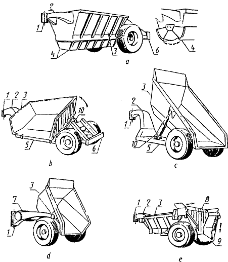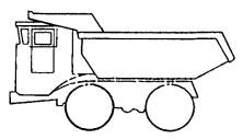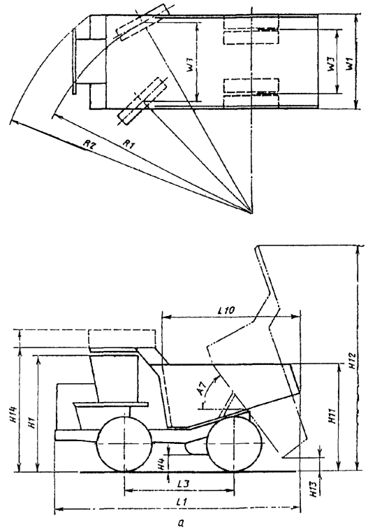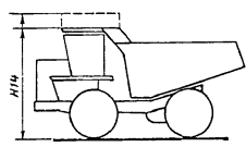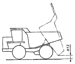 а - донная разгрузка; b - боковая разгрузка; с - задняя разгрузка; d - задняя разгрузка; е - задняя разгрузка 6. ЭКСПЛУАТАЦИОННАЯ ТЕРМИНОЛОГИЯ6.1. Мощность нетто двигателя - по ИСО 1585. 6.2. Максимальная скорость движения - по ИСО 6014. 6.3. Тяговое усилие на ведущих колесах - усилие в точке контакта шины с опорной поверхностью, приводящее землевоз в движение. 6.3.1. Тяговое усилие на ведущих колесах машины с механической трансмиссией - усилие, определяемое расчетом или измерениями при номинальной частоте вращения коленчатого вала и максимальном крутящем моменте двигателя на каждой передаче переднего хода. Максимальное тяговое усилие может быть ограничено массой машины и условиями сцепления шин с грунтом. 6.3.2. Тяговое усилие на ведущих колесах машины с гидромеханической; электрической или гидрообъемной трансмиссией - усилие, характеризуемое кривыми зависимости тягового усилия от скорости движения машины на каждой передаче переднего хода, полученными расчетом или измерением. Максимальное тяговое усилие может быть ограничено массой машины и условиями сцепления шин с грунтом. 6.4. Время разгрузки порожнего кузова с возвратом - время, необходимое для имитации разгрузки и возврата кузова, заслонок или выталкивателя в исходное положение при номинальной частоте вращения коленчатого вала двигателя. 6.5. Управляемость 6.5.1. Радиус поворота - по ГОСТ 27257-87 (ИСО 7457). 6.5.2. Габаритный диаметр поворота - по ГОСТ 27257-87 (ИСО 7457). 6.6. Эффективность торможения - по ИСО 3450. 6.7. Масса номинального груза - указанная изготовителем масса груза для перевозки в кузове. 7. ТЕХНИЧЕСКАЯ ХАРАКТЕРИСТИКА ДЛЯ КОММЕРЧЕСКОЙ ДОКУМЕНТАЦИИ, ВЫРАЖЕННАЯ В ЕДИНИЦАХ СИ (ПРИМЕРЫ)7.1. Двигатель (привести характеристики): изготовитель и модель; с воспламенением от сжатия или с искровым зажиганием; тактность (двух- или четырехтактный); с естественным всасыванием, механическим наддувом или газотурбонаддувом; число цилиндров; диаметр цилиндра; ход поршня; рабочий объем цилиндров; система охлаждения (воздушное или водяное); вид топлива; мощность-нетто на маховике ... при ... об/мин.; максимальный крутящий момент ... при … об/мин.; тип стартера; напряжение в системе электрооборудования ... В. 7.2. Трансмиссия (указать тип) Примеры: с ручным переключением, со сцеплением на маховике; с сервопереключением передач, с гидротрансформатором; объемная гидропередача; электрическая трансмиссия; число скоростей переднего и заднего хода. Скорости движения вперед и назад (следует привести график зависимости тягового усилия на ведущих колесах от скорости движения). 7.3. Ведущий мост (мосты) (указать тип) Примеры: управляемый; жестко закрепленный, балансирный и (или) с подвеской; гидрообъемный; электрический; коническая передача; дифференциал: стандартный, самоблокирующийся с муфтой свободного хода, с механизмом блокировки; планетарная конечная передача. 7.4. Рулевое управление (указать тип) (ГОСТ 27254-87 (ИСО 5010). Примеры: шарнирно-сочлененная рама; передние управляемые колеса; с усилителем, ручное, гидрообъемное; аварийное. 7.4.1. Эффективность: радиус поворота ...., влево и вправо; габаритный диаметр поворота машины. 7.5. Тормоза 7.5.1. Рабочие тормоза Примеры: тип (колодочные, дисковые, мокрые или сухие); система привода (механическая, пневматическая, гидравлическая, электрическая, комбинированная и т.д.). 7.5.2. Стояночный тормоз (указ