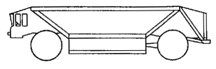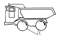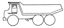 R1 - радиус поворота; R2 - габаритный радиус поворота; а - землевоз с жесткой рамой; b - землевоз со сдвоенным задним мостом, с - полуприцепной землевоз Черт. 12 5.3. Масса 5.3.1. Эксплуатационная масса - масса базовой машины с порожним кузовом, с полностью заправленными топливным баком, гидросистемой, системами смазывания и охлаждения и с учетом массы оператора (75 кг). 5.3.2. Масса груженой машины - сумма эксплуатационной массы и массы номинального груза, указанной изготовителем. 5.3.3. Распределение массы по осям - масса, приходящаяся на каждую ось машины в порожнем и груженом состояниях. 5.3.4. Отгрузочная масса - масса базовой машины без оператора, с порожним кузовом, с полностью заправленными гидросистемой, системами смазывания и охлаждения, с 10 %-ной заправкой топливного бака, а также с кабиной, тентом и устройством ROPS* или без них по указанию изготовителя. ____________ * ROPS - устройства защиты при опрокидывании. 5.3.5. Масса кабины, тента, устройства ROPS - масса кабины, тента и устройства ROPS со всеми их составными частями и элементами крепления к базовой машине. 5.4. Наименования составных частей 5.4.1. Наименования составных частей двухосного землевоза: 1 - бампер; 2 - шкворень буксирного приспособления; 3 - кабина; 4 - крыло; 5 - колесо; 6 - шина; 7 - тормоз; 8 - брус выталкивателя кусков породы; 9 - подвеска (дополнительная); 10 - ось шарнира крепления кузова; 11 - мост (мосты); 12 - стойка, удерживающая поднятый кузов; 13 - кузов; 14 - гидроцилиндр подъема кузова; 15 - система привода; 16 - трубопровод отвода выхлопных газов в атмосферу или на обогрев кузова; 17 - козырек; 18 - основная рама; 19 - капот; 20 - лестница, 21 - силовая установка; 22 - решетка радиатора.