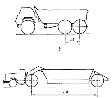 Расстояние по координате Х между двумя плоскостями X, проходящими через центры задних колес тягача и задних колес полуприцепа. Для машин со сдвоенным мостом за центр колес принимают линию, проходящую посредине расстояния между двумя осями колес сдвоенного моста |