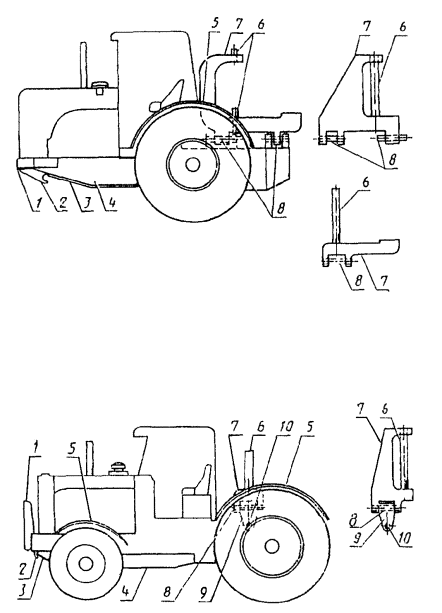 5.4.2. Наименования составных частей двух- и четырехколесного трактора (тягача): 1 - бампер; 2 - буксирный крюк; 3 - нижний защитный лист картера; 4 - основная рама; 5 - крыло; 6 - шкворень сцепного устройства; 7 - сцепное устройство; 8 - ось шарнира поперечного качания; 9 - серьга сцепного устройства; 10 - ось шарнира продольного качания.