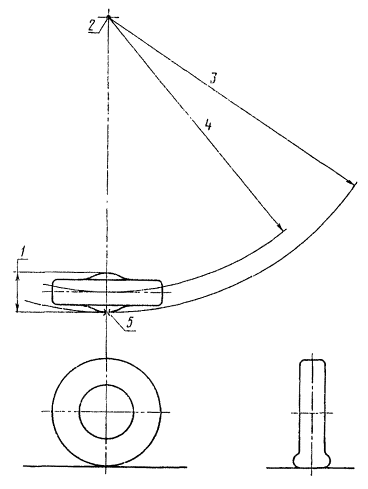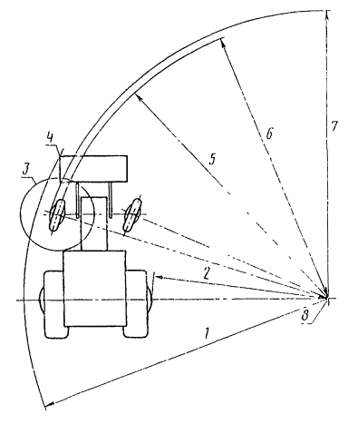Черт. 4 б) Рулевое колесо поворачивают вправо на максимально возможный угол при стационарном положении машины. Затем машину ведут передним ходом, по-прежнему выдерживая максимально возможный угол поворота вправо. Выполняют поворот на 270°, делая регулярные остановки и отмечая окружность поворота по типам, как указано в п. 8.1.2. В начале поворота отмечают окружность поворота по шине, ближайшей к линии, упомянутой в п. 8.1.7 а. в) Измеряют расстояние по перпендикуляру от линии по п. 8.1.7а до ближайшей и дальней дуг окружности поворота по шинам. Разность этих двух значений должна быть равна ширине полосы безостановочного разворота вправо. 8.1.8. Допускается применять другие методы определения диаметров поворота, обеспечивающие эквивалентную точность измерений. 8.1.9. Каждое испытание повторяют три раза и в протоколе испытаний регистрируют среднее арифметическое полученных значений параметров поворота. 8.2. Поворот влево Повторяют действия по п. 8.1, но машину ведут при полном повороте влево. 9. ПОРЯДОК ФАКУЛЬТАТИВНЫХ ИСПЫТАНИЙ ДЛЯ МАШИН С РАЗДЕЛЬНЫМ ВКЛЮЧЕНИЕМ ЛЕВЫХ И ПРАВЫХ ТОРМОЗОВ НА НЕУПРАВЛЯЕМЫХ КОЛЕСАХПовторяют действия по разд. 8 при включении тормоза внутреннего неуправляемого колеса с усилием нажатия на педаль 450 Н или с усилием, необходимым для блокировки колеса, если это усилие меньше 450 Н. Полученные результаты заносят в протокол, указав «с тормозами». Результаты испытаний по разд. 8 указывают в протоколе с пометкой «без тормозов». 10. ПРОТОКОЛ ИСПЫТАНИЯ.В протоколе указывают следующую информацию: а) наименование предприятия-изготовителя; б) тип машины; в) модель машины, серийный номер; г) установленное оборудование и его положение; д) размеры шин: левая передняя .... правая передняя .... левая задняя .... правая задняя .... е) внутреннее давление в шинах, МПа: левая передняя .... правая передняя .... левая задняя .... правая задняя .... ж) ширина колеи (мм) для всех мостов; з) внешний диаметр поворота по шинам, м: 1) поворот вправо без тормозов; 2) поворот влево без тормозов; и в нужных случаях: 3) поворот вправо с тормозами; 4) поворот влево с тормозами; и) внутренний диаметр поворота по шинам, м: 1) поворот вправо без тормозов; 2) поворот влево без тормозов; и в нужных случаях: 3) поворот вправо с тормозами; 4) поворот влево с тормозами. к) диаметр поворота, м: 1) поворот вправо без тормозов; 2) поворот влево без тормозов; и в нужных случаях: 3) поворот вправо с тормозами; 4) поворот влево с тормозами; л) габаритный диаметр поворота машины, м: 1) поворот вправо без тормозов; 2) поворот влево без тормозов; и в нужных случаях: 3) поворот вправо с тормозами; 4) поворот влево с тормозами; м) ширина полосы безостановочного разворота, м: 1) разворот вправо без тормозов; 2) разворот влево без тормозов; и в нужных случаях: 3) разворот вправо с тормозами; 4) разворот влево с тормозами. Примечание. Все линейные размеры в протоколе указывают в метрах с точностью до второго десятичного знака. ПРИЛОЖЕНИЕОбязательное ССЫЛОЧНЫЕ НОРМАТИВНО-ТЕХНИЧЕСКИЕ ДОКУМЕНТЫ