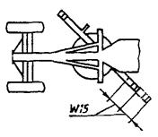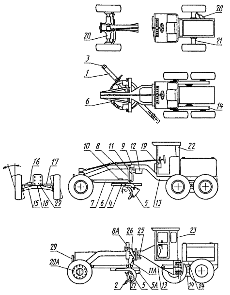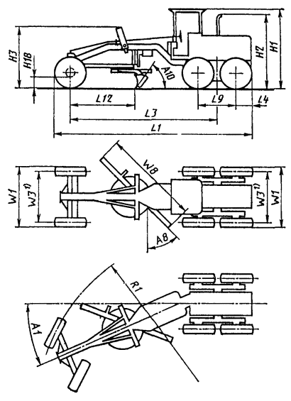 Дата введения 01.01.89 1. НАЗНАЧЕНИЕНастоящий стандарт устанавливает термины, определения и содержание технической характеристики для коммерческой документации по автогрейдерам и их рабочему оборудованию. 2. ОБЛАСТЬ ПРИМЕНЕНИЯНастоящий стандарт распространяется на автогрейдеры по п. 4. 3. ССЫЛКИСсылочные документы приведены в обязательном приложении 1. 4. ОБЩИЕ ОПРЕДЕЛЕНИЯ4.2. Базовая машина - автогрейдер без рабочего оборудования, соответствующий технической документации изготовителя. Машина должна быть снабжена необходимыми местами крепления для установки дополнительного оборудования по п. 6. 4.3. Рабочее оборудование - комплект составных частей, монтируемых на базовую машину для обеспечения выполнения ее основной функции в соответствии с назначением. 4.4. Дополнительное оборудование - поставляемая по выбору заказчика сборочная единица из составных частей, которая может быть смонтирована на базовой машине для специального применения. 4.5. Составная часть - деталь или сборочная единица из деталей базовой машины, рабочего или дополнительного оборудования. 5. БАЗОВАЯ МАШИНА5.1. Типы автогрейдеров 5.1.1. По числу колес ходовой части 5.1.1.1. Четырехколесные (см. черт. 1) 5.1.1.2. Шестиколесные (см. черт. 2) 5.1.2. По числу двигателей 5.1.2.1. Одномоторные (см. черт. 3) 5.1.2.2. Двухмоторные (см. черт. 4) 5.1.3. По расположению двигателя 5.1.3.1. С передним расположением двигателя (см. черт. 5) 5.1.3.2. С задним расположением двигателя (см. черт. 6) 5.1.4. По системе управления поворотом 5.1.4.1. С передними управляемыми колесами (см. черт. 7) 5.1.4.2. С передними и задними управляемыми колесами (см. черт. 8) 5.1.4.3. С передними управляемыми колесами и поворотной задней тележкой (см. черт. 9) 5.1.4.4. С передними управляемыми колесами и шарнирно-сочлененной рамой (см. черт. 10) 5.1.4.5. С шарнирно-сочлененной рамой, имеющей два вертикальных шарнира (см. черт. 11) 5.1.5. По системе привода хода 5.1.5.1. С двумя ведущими колесами (см. черт. 12) 5.1.5.2. С четырьмя ведущими колесами (см. черт. 13) 5.1.5.3. С шестью ведущими колесами (см. черт. 14) Четырехколесный автогрейдер Черт. 1 Шестиколесный автогрейдер Черт. 2 Одномоторный автогрейдер Черт. 3 Двухмоторный автогрейдер Черт. 4 Автогрейдер с передним расположением двигателя Черт. 5 Автогрейдер с задним расположением двигателя Черт. 6 Автогрейдер с передними управляемыми колесами 1 - управляемые колеса Черт. 7 Автогрейдер с передними и задними управляемыми колесами 1 - управляемые колеса Черт. 8 Автогрейдер с передними управляемыми колесами и поворотной задней тележкой 1 - управляемые колеса; 2 - центр поворота Черт. 9 Автогрейдер с передними управляемыми колесами и шарнирно-сочлененной рамой 1 - управляемые колеса; 2 - центр поворота Черт. 10 Автогрейдер с шарнирно-сочлененной рамой, имеющей два вертикальных шарнира 1 - центр поворота Черт. 11 Автогрейдер с двумя ведущими колесами 1 - ведущие колеса Черт. 12 Автогрейдер с четырьмя ведущими колесами 1 - ведущие колеса Черт. 13 Автогрейдер с шестью ведущими колесами 1 - ведущие колеса Черт. 14 5.2. Размерные характеристики (см. черт. 15). Размеры базовой машины (автогрейдера) _________ 1 Колея W3 может быть разной для передних и задних колес. Черт. 16 Определения размерных характеристик - по ИСО 6746/1. Определения размерных характеристик, относящихся только к автогрейдерам, а также определения Н18, Н19, W9, W14, W15, А9, A11, A12 приведены в приложении А. Черт. 15а 5.3. Масса 5.3