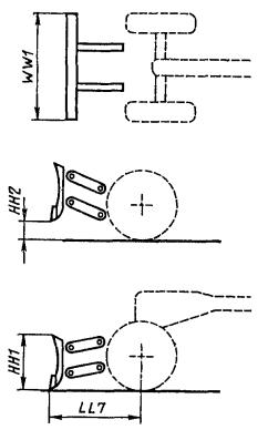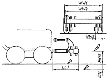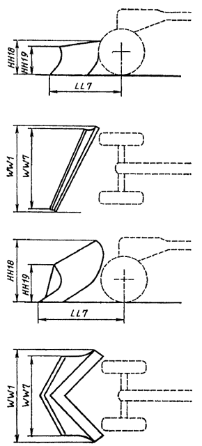 Черт. 16 6.12. Рыхлитель - дополнительное оборудование, состоящее из рамы, соединенной посредством кронштейнов крепления с задней частью базовой машины, и снабженное одним или несколькими зубьями (см. черт. 17). Размеры рыхлителя Черт. 17 6.1.3. Плужный снегоочиститель - конструкция, размещенная впереди передних колес и предназначенная для сдвигания снега в поперечном направлении за счет вспахивающего действия отвала. Плуг может быть одноотвальным и двухотвальным (см. черт. 18). Размеры плужного снегоочистителя Черт. 18 6.1.4. Передний отвал - отвал, обычно имеющий криволинейную поверхность, размещенный впереди передних колес и предназначенный для сгребания и толкания материала, обычно в направлении вперед (см. черт. 19). Размеры переднего отвала Черт. 19 6.2. Размерные характеристики 6.2.1. Определения размерных характеристик - по ИСО 6746/2. 6.2.2. Определения размерных характеристик, относящихся только к дополнительному оборудованию автогрейдеров, приведены в приложении В. 6.3. Наименование составных частей (см. номера позиций на черт. 20-22). 6.3.1. Кирковщик