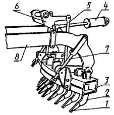 а) гидравлический б) механический 1 - наконечник зуба; 2 - стойка зуба; 3 - рабочая балка; 4 - гидроцилиндр, 5 - тяга механизма подъема; 6 - рычаг механизма подъема; 7 - механизм регулирования угла наклона зубьев; 8 - брус Черт. 20 Наименование составных частей рыхлителя - по ИСО 6747. 6.3.3. Плужный снегоочиститель