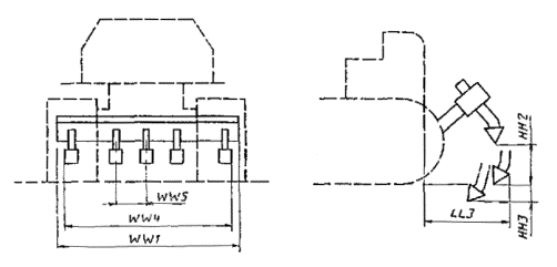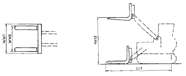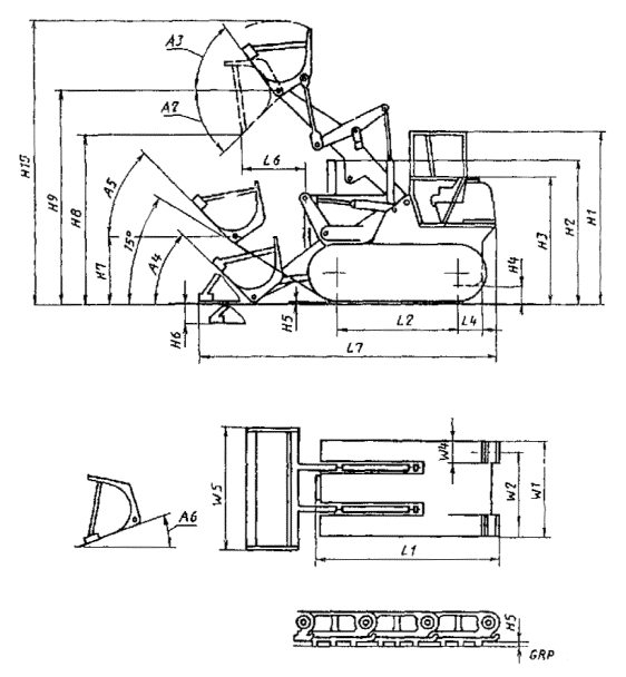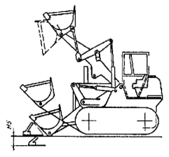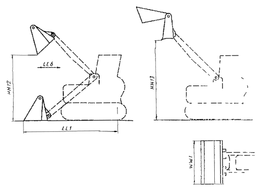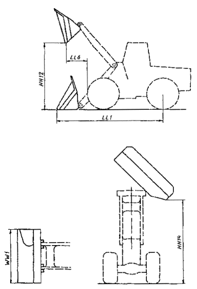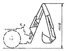 стрела; 5 - стреловой цилиндр; Примечание. В соответствующих случаях наименования позиции 7, 8, 9 и 10 могут дополняться определениями «передний» или «задний». 6. РАБОЧЕЕ И ДОПОЛНИТЕЛЬНОЕ ОБОРУДОВАНИЕ6.1. Определения 6.1.1. Обратная лопата - механизм, навешиваемый на заднюю часть погрузчика, который обычно копает материал ниже уровня стоянки, поднимает, перемещает с поворотом и выгружает материал, действуя стрелой, рукоятью и ковшом. Копание осуществляется движением ковша в направлении к машине. Обратная лопата поворачивается в плане на угол менее 360° (см. черт. 17). 6.1.2. Рыхлитель - механизм с зубьями для внедрения и рыхления на малую глубину грунта, асфальтовых, гравийных и других дорожных покрытий. Рыхлитель обычно навешивают сзади погрузчика, но он может быть установлен и на задней стороне ковша (см. черт. 18). 6.1.3. Ковш с боковой разгрузкой - ковш, который заполняется при движении машины вперед и может выгружать материал через какую-либо боковую сторону ковша. Он может также выгружать материал вперед (см. черт. 19). 6.1.4. Двухчелюстной ковш - ковш, задняя челюсть которого выполнена в виде бульдозерного отвала с шарнирами в верхней части для крепления передней челюсти, которую можно устанавливать в разные положения, позволяющие использовать оборудование в качестве бульдозера, скрепера, грейфера или погрузочного ковша (см. черт. 20). 6.1.5. Грузовые вилы - конструкция с вилками для подъема, транспортирования и разгрузки складских поддонов (см. черт. 21). 6.1.6. Челюстной захват - механизм с вилками и верхним прижимом для подъема, транспортирования и разгрузки бревен (см. черт. 22). 6.1.7. Лебедка - механизм с барабаном, смонтированный на задней части рамы машины (см. черт. 23). 6.1.8. Основной ковш - ковш для работы с материалами с объемной массой 1,6-1,8 т/м3. (Введен дополнительно, Изм. № 1). 6.1.9. Увеличенный (уменьшенный) ковш - ковш для работы с легкими (тяжелыми) материалами. (Введен дополнительно, Изм. № 1). 6.1.10. Скелетный ковш - ковш для выборочного захвата крупнокусковых материалов. (Введен дополнительно, Изм. № 1). 6.1.11. Ковш с принудительной разгрузкой - ковш, опорожнение которого осуществляется подвижной частью с силовым приводом. (Введен дополнительно, Изм. № 1). 6.1.12. Крановая безблочная стрела - рабочий орган для подъема и транспортирования штучных грузов на крюковой подвеске. (Введен дополнительно, Изм. № 1). 6.1.13. Позиционер ковша - устройство для автоматической остановки ковша погрузчика в предварительно заданное положение. (Введен дополнительно, Изм. № 1). 6.1.14. Конечный останов ковша - устройство для автоматической остановки ковша на предварительно заданной высоте. (Введен дополнительно, Изм. № 1). Черт. 17. Размеры обратной лопаты 6.2. Размерные характеристики 6.2.1. Определения размерных характеристик - по ИСО 6746/2. 6.2.2. Определения размерных характеристик, относящихся только к рабочему и дополнительному оборудованию погрузчиков, приведены в приложении В. Черт. 18. Размеры рыхлителя Черт. 19. Размеры ковша с боковой разгрузкой Черт. 20. Размеры двухчелюстного ковша Черт. 21. Размеры грузовых вил Черт. 22. Размеры челюстного захвата Черт. 23. Размеры лебедки 6.3. Наименования составных частей (см. номера позиций на схеме) 6.3.1. Ковш с боковой разгрузкой