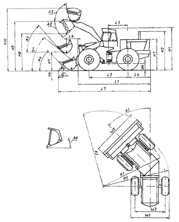 17 - режущая кромка бульдозерной (нижней) челюсти; 18 - бульдозерная (нижняя) челюсть; 19 - верхняя (подвижная) челюсть; 20 - коромысло; 21 - тяга верхней челюсти; 22 - гидроцилиндр открывания челюсти; 23 - режущая кромка верхней челюсти 7. ЭКСПЛУАТАЦИОННАЯ ТЕРМИНОЛОГИЯ7.1. Мощность - нетто двигателя по ИСО 1585 7.2. Опрокидывающая нагрузка - по ИСО 8313. (Новая редакция, Изм. № 1). 7.3. Номинальная грузоподъемность - по ИСО 5998. (Новая редакция, Изм. № 1). 7.4. Номинальная вместимость (геометрический объем и объем «шапки») ковша погрузчика - по ИСО 7546. (Новая редакция, Изм. № 1). 7.5. Вырывное усилие - по ИСО 8313. (Новая редакция, Изм. № 1). 7.6. Время подъема ковша - время, необходимое для подъема на максимальную высоту ковша с указанным номинальным грузом, лежащего на опорной плоскости отсчета в полностью запрокинутом положении. 7.7. Время опускания ковша - время, необходимое для опускания порожнего ковша с максимальной высоты в положение, при котором днище ковша ляжет на опорную плоскость отсчета. 7.8. Время разгрузки ковша - время, необходимое для поворота ковша из полностью запрокинутого положения в полностью опрокинутое положение при выгрузке номинального груза. 7.9. Максимальная скорость движения - максимальная скорость, которую можно получить на твердой горизонтальной поверхности при движении погрузчика с порожним ковшом на каждой из передач переднего и заднего хода (см. ИСО 6014). 7.10. Тормозная эффективность (колесного погрузчика) по ИСО 3450. 7.11. Диаметр поворота по ГОСТ 27257-87. 8. ТЕХНИЧЕСКАЯ ХАРАКТЕРИСТИКА ДЛЯ КОММЕРЧЕСКОЙ ДОКУМЕНТАЦИИ,