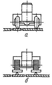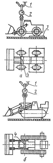 Примечание. Массы других частей машины следует измерять аналогично. Весы Черт. 1 Весы или динамометр сжатия Черт. 2 Крановый крюк и динамометр растяжения Черт. 3 Весы или динамометр сжатия Черт. 4 Весы или динамометр сжатия Черт. 5 ПРИЛОЖЕНИЕ АДИНАМОМЕТР РАСТЯЖЕНИЯМетод измерения (см. п. 4.3.1) Динамометр растяжения применять не рекомендуется, но если его используют, то измерения проводят в следующем порядке: а) при взвешивании передней или задней части машины точка подвески динамометра должна находиться точно на линии пересечения вертикальных плоскостей, проходящих через мост машины (передний или задний) и через главную продольную ось машины (черт. 6а и 6б); б) при взвешивании одной стороны машины точка подвески динамометра должна находиться точно на линии пересечения вертикальных плоскостей, проходящих через продольную ось соответственно левосторонних или правосторонних колес или гусениц и через главную поперечную ось всей машины (черт. 7а и 7б). В обоих случаях машина должна быть в горизонтальном положении. Взвешивание передней или задней частей машины 1 - крюк подъемного крана; 2 - динамометр; 3 - подкладная платформа; 4 - стальной канат к динамометру Черт. 6 Взвешивание одной стороны машины 1 - крюк подъемного крана; 2 - динамометр растяжения; 3 - подкладная платформа; 4 - стальной канат к динамометру Черт. 7 ИНФОРМАЦИОННЫЕ ДАННЫЕ 1. ВНЕСЕН Министерством строительного, дорожного и коммунального машиностроения СССР 2. Постановлением Государственного комитета СССР по стандартам от 29.11.88 № 3876 введен в действие государственный стандарт СССР ГОСТ 27922-88, в качестве которого непосредственно применен международный стандарт ИСО 6016-82, с 01.01.90 3. ВВЕДЕН ВПЕРВЫЕ СОДЕРЖАНИЕ