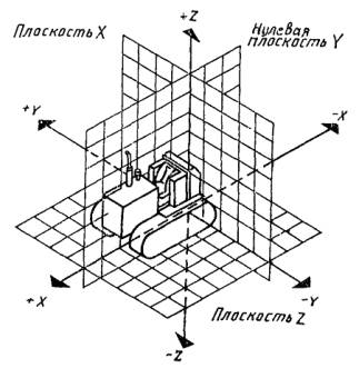 Дата введения 01.01.92 1. НАЗНАЧЕНИЕ И ОБЛАСТЬ ПРИМЕНЕНИЯСтандарт устанавливает термины и определения, условные обозначения размерных характеристик базовых землеройных машин. Стандарт распространяется на основные типы землеройных машин по ГОСТ* (ИСО 6165). * Государственный стандарт на стадии утверждения. Примечание. В СССР требования данного стандарта являются обязательными. 2. ССЫЛКИСсылочные документы приведены в информационных данных. 3. ТЕРМИНЫ И ОПРЕДЕЛЕНИЯ3.1. Трехмерная система координат - см. приложение А. 3.2. Опорная плоскость отсчета (GRP) - нулевая плоскость Z, на которую помещают машину для проведения измерений. Опорной плоскостью отсчета являются: а) для колесных машин - твердая ровная поверхность; б) для гусеничных машин: нижняя поверхность башмаков с грунтозацепами (см. Н5) (для тракторов, трубоукладчиков); вершина грунтозацепа (см. Н5) (для погрузчиков, экскаваторов); половина расстояния от поверхности болтового присоединения к звену гусеничной цепи до вершины грунтозацепа (см. Н5). На машине должны быть предусмотрены места крепления рабочего оборудования, указанного в ГОСТ 28632 (ИСО 6746/2). 4. ОБЩИЕ ПОЛОЖЕНИЯПриложения В, С, D и F содержат условные обозначения и определения терминов, относящихся к размерным характеристикам базовых землеройных машин. 5. СИСТЕМА КОДИРОВАНИЯРазмерам, приведенным в приложениях В, С, D, Е, и F, присвоен код, состоящий из прописной буквы (см. п. 5.1) и номера по международному стандарту (см. п. 5.2). 5.1. Прописная буква, обозначающая размер: H - по высоте; W - по ширине; L - по длине; R - радиальный; А - угловой. 5.2. Номер по международному стандарту, обозначающий конкретную машину (см. ГОСТ 28633 (ИСО 6746/1), ГОСТ 27721 (ИСО 7131), ГОСТ 27249 (ИСО 7132), ГОСТ 27536 (ИСО 7133), ГОСТ 27535 (ИСО 7134), ГОСТ 27963 (ИСО 7136), ГОСТ* (ИСО 7135) соответственно). * Государственный стандарт на стадии разработки. ПРИЛОЖЕНИЕ АТРЕХМЕРНАЯ СИСТЕМА КООРДИНАТA.1. Система координат Настоящее приложение устанавливает трехмерную систему координат, используемую для определения размеров землеройных машин. Систему не следует использовать в коммерческой документации. А.2. Термины и определения А.2.1. Нулевая плоскость Y - вертикальная плоскость, проходящая через продольную осевую линию машины. А.2.2. Плоскость Х - любая вертикальная плоскость, перпендикулярная к плоскости Y. А.2.3. Плоскость Z - любая горизонтальная плоскость, перпендикулярная к плоскостям Х и Y. А.2.4. Положительная координата - положительное направление: вперед от нулевой плоскости Х, вправо от нулевой плоскости Y и вверх от нулевой плоскости Z. Примечания: 1. Оси X, Y и Z (нулевые плоскости) пересекаются под прямым углом в определенной точке (например, в точке SIP, т.е. контрольной точке сиденья; на осевой линии коленчатого вала двигателя, на осевой линии ведущего колеса или заднего моста трактора, на уровне опорной поверхности при проведении измерений машины). 2. Если показаны только части машины (например двигатель, сиденье), то положение и положительное направление оси от точки пересечения осей X, Y, и Z (нулевых плоскостей) принимают с учетом ориентации данной части относительно машины (например ориентации первого цилиндра двигателя или сиденья относительно передней части машины). 3. Если на схеме показаны машина и (или) ее рабочее оборудование, то принимают, что машина движется справа налево.