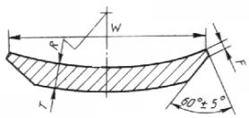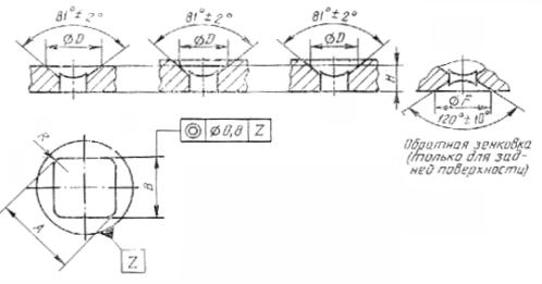 Черт. 8 Примечание. Число рядов отверстий определяет заказчик. А.3.2. Центр зенковки должен находиться в пределах круговой зоны допуска диаметром 3,2 мм, очерченной вокруг точки, соответствующей геометрически правильному положению. А.3.3. Кривизна ножа не должна превышать 6 мм/м. А.4. Отверстия под болты крепления. Формы и размеры Формы и размеры отверстий под болты крепления должны соответствовать указанным в табл. А6 и черт. 9. Отверстия под болты крепления D - диаметр обратной зенковки для эффективной толщины Н; В - ширина между гранями квадратного отверстия; Н - минимальная эффективная толщина; R - радиус закругления квадратного отверстия; А - размер по диагонали квадратного отверстия; F - диаметр обратной зенковки квадратного отверстия Черт. 9 Таблица А6 мм
