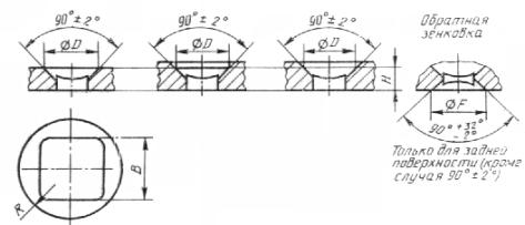 * Допускается не указывать для малогабаритных машин. Примечание. Формы и размеры ножей с шагом отверстий 140 мм и 280 мм приведены в приложении А. 4.2. Центр зенковки должен находиться в пределах круговой зоны допуска диаметром 3,2 мм, очерченной вокруг точки, соответствующей геометрически правильному положению. 4.3. Кривизна ножа не должна превышать 2 мм/м. 5. ОТВЕРСТИЯ ПОД БОЛТЫ КРЕПЛЕНИЯ. ФОРМЫ И РАЗМЕРЫ5.1. Формы и размеры отверстий под болты крепления должны соответствовать указанным в табл. 5 и черт. 4. 5.2. Несоосность квадратного отверстия с зенковочным конусом не должна превышать 0,8 мм. Отверстия под болты крепления D - диаметр обратной зенковки для эффективной толщины Н; В - ширина между гранями квадратного отверстия; Н - минимальная эффективная толщина; R - радиус закругления квадратного отверстия; А - размер по диагонали квадратного отверстия; F - диаметр обратной зенковки квадратного отверстия Черт. 4 Таблица 5 мм