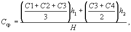 где С1 - среднее число ударов на поверхности грунта; С2 - среднее число ударов на средней глубине промерзшего слоя грунта (или слоя немерзлого грунта, плотность которого отличается от плотности нижележащего слоя грунта); С3 - среднее число ударов на границе промерзшего и немерзлого грунта, плотность которых отличается друг от друга; С4 - среднее число ударов на дне траншеи; h1 - глубина промерзания грунта (или толщина немерзлого грунта, плотность которого отличается от плотности нижележащего слоя грунта), м; h2 - толщина немерзлого слоя грунта (или толщина немерзлого слоя грунта, плотность которого отличается от плотности вышележащего слоя грунта), м; Н - глубина копания, м. Примечание. Среднее число ударов динамического плотномера C1-С2 следует определить как среднеарифметические значения измерений, выполняемых не менее чем в трех точках на поверхности грунта, на равной глубине и на дне траншеи. Динамический плотномер