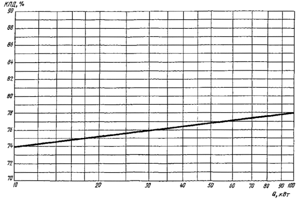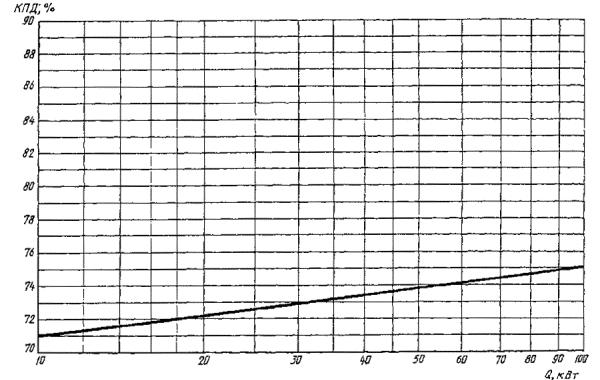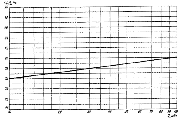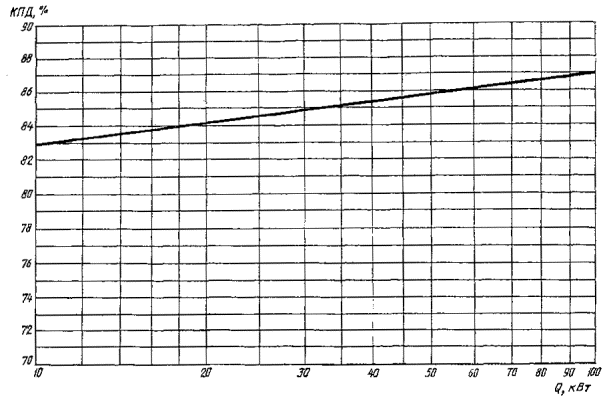 Дата введения 01.01.88 Настоящий стандарт распространяется на отопительные водогрейные котлы (далее - котлы) номинальной теплопроизводительностью до 100 кВт, с рабочим давлением воды до 0,4* МПа и максимальной температурой воды на выходе из котла до 95 °С, предназначенные для теплоснабжения индивидуальных жилых домов и зданий коммунально-бытового назначения, оборудованных системами водяного отопления с естественной или принудительной циркуляцией и горячего водоснабжения. * По заказу потребителя до 0,5 МПа. Стандарт не распространяется на конденсационные котлы. (Измененная редакция, Изм. № 1). 1. ТИПЫ И ОСНОВНЫЕ ПАРАМЕТРЫ1.1. Котлы подразделяются на: универсальные - работающие при соответствующем переоборудовании на твердом (одного или нескольких видов), жидком или газообразном топливе; специализированные - работающие на одном или нескольких видах топлива с применением однородного способа сжигания. Номинальную теплопроизводительность стальных котлов следует выбирать из ряда: 10,0; 12,5; 16,0; 20,0; 25,0; 31,5; 40,0; 50,0; 63,0; 80,0; 100,0 кВт. Допускаемые отклонения номинальной теплопроизводительности ± 10 %. Коэффициент полезного действия котлов, работающих в режиме отопления, должен быть не менее определенного по графикам на черт. 1 - 5. При оснащении котла водоподогревателем допускается снижение этого значения не более чем на 2 %. График зависимости КПД котлов для сжигания жидкого топлива и газа, оборудованных горелками с принудительной подачей воздуха, от теплопроизводительности Черт. 1 График зависимости КПД котлов, оборудованных атмосферными горелками для сжигания газа, от теплопроизводительности
