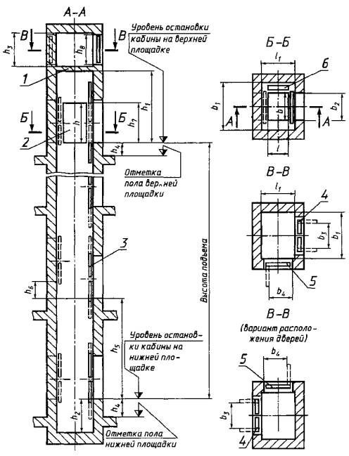 * Необходимое расстояние h4 для каждой погрузочной площадки указывают при заказе лифта. ** Для лифтов со скоростью 0,5 м/с. Примечание. В скобках указаны наружные размеры кабины. (Измененная редакция, Изм. № 1). 10. На верхней погрузочной площадке на расстоянии не более 3 м от шахты лифта должно быть предусмотрено место или ниша шириной 1 м, высотой 2 м и глубиной не менее 0,7 м для установки электрооборудования. 11. Строительная часть лифтов должна соответствовать требованиям технической документации базовой организации по стандартизации лифтов. 12. Лифты, предназначенные для двух остановок высотой подъема до 5,2 м, допускается изготавливать в металлокаркасной шахте. (Введен дополнительно, Изм. № 1).