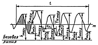 где Hmax i - расстояние от высшей до низшей точки i-й наибольшей неровности (черт. 1); n - число наибольших неровностей (не менее 5). Rm - наибольшая высота неровностей профиля, вычисленная по формуле (черт. 2). Черт. 1 yi - отклонение профиля от средней линии; l - базовая длина; hmax i - расстояние от высшей точки i-го наибольшего выступа до линии, эквидистантной средней и непересекающей профиль; hmax i - расстояние от низшей точки i-ой наибольшей впадины до линии, эквидистантной средней и непересекающей профиль; Szi - шаг i-ой неровности по впадинам; m - средняя линия профиля Черт. 2 Rm=yp max+yn max, где yp max - расстояние от средней линии профиля до высшей точки профиля в пределах базовой длины; yn max - расстояние от средней линии профиля до низшей точки профиля в пределах базовой длины; Rz - высота неровностей профиля по десяти точкам при отсчете от базовой линии, вычисленная по формуле (черт. 2)